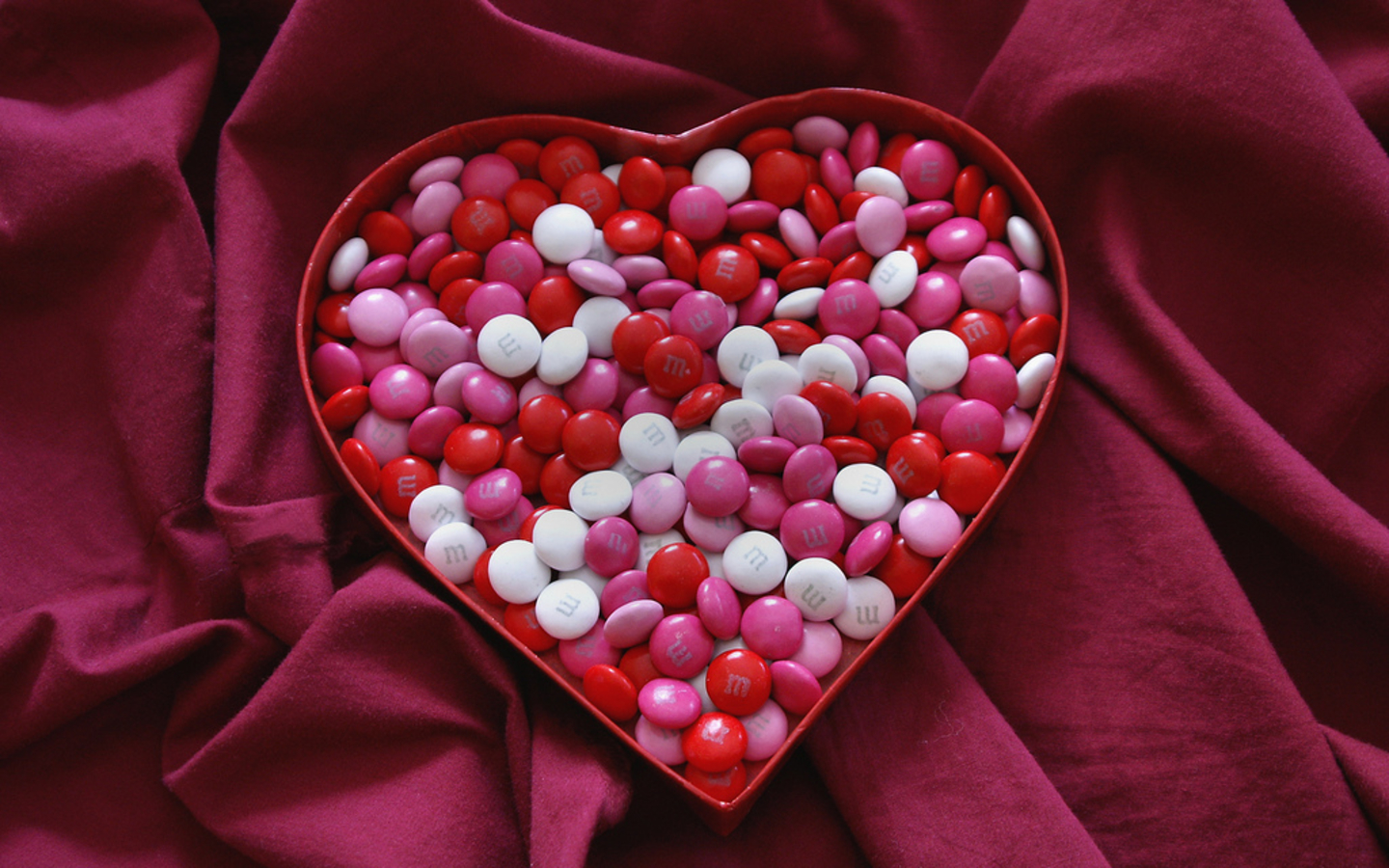 Description: A heart shaped box filled with candy hearts on a purple cloth background with a red cloth behind it and a pink satin.