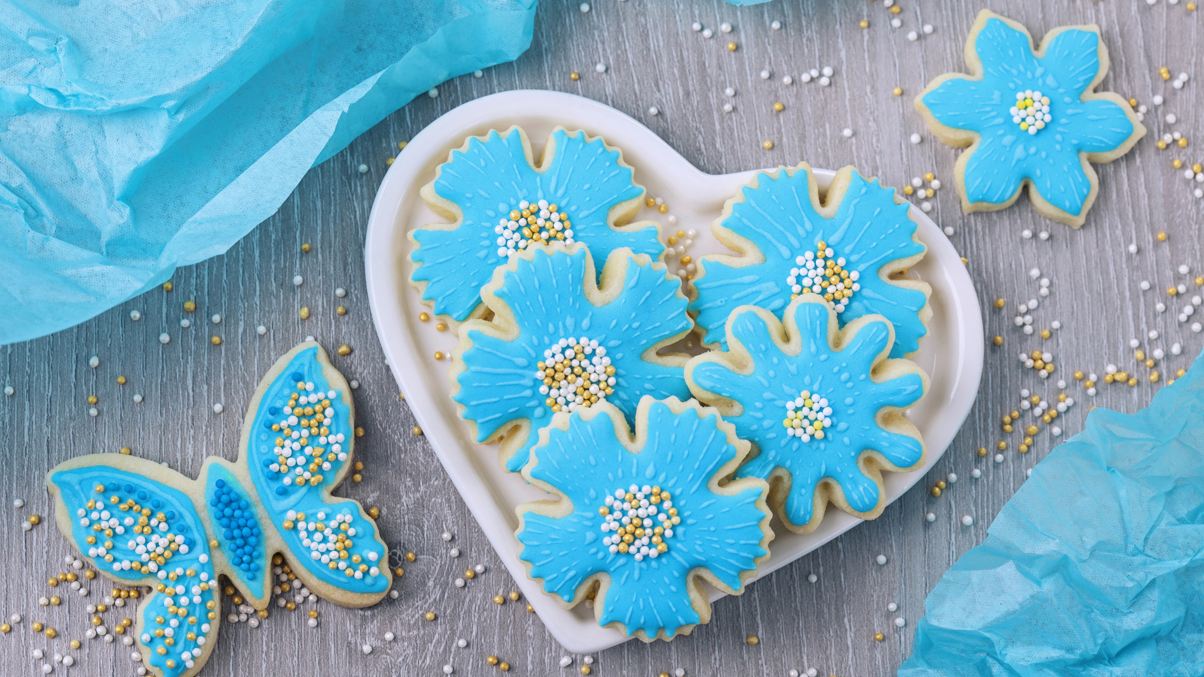 Description: A heart shaped cookie with blue flowers and butterflies on it next to a blue tissue paper bag and blue tissue.