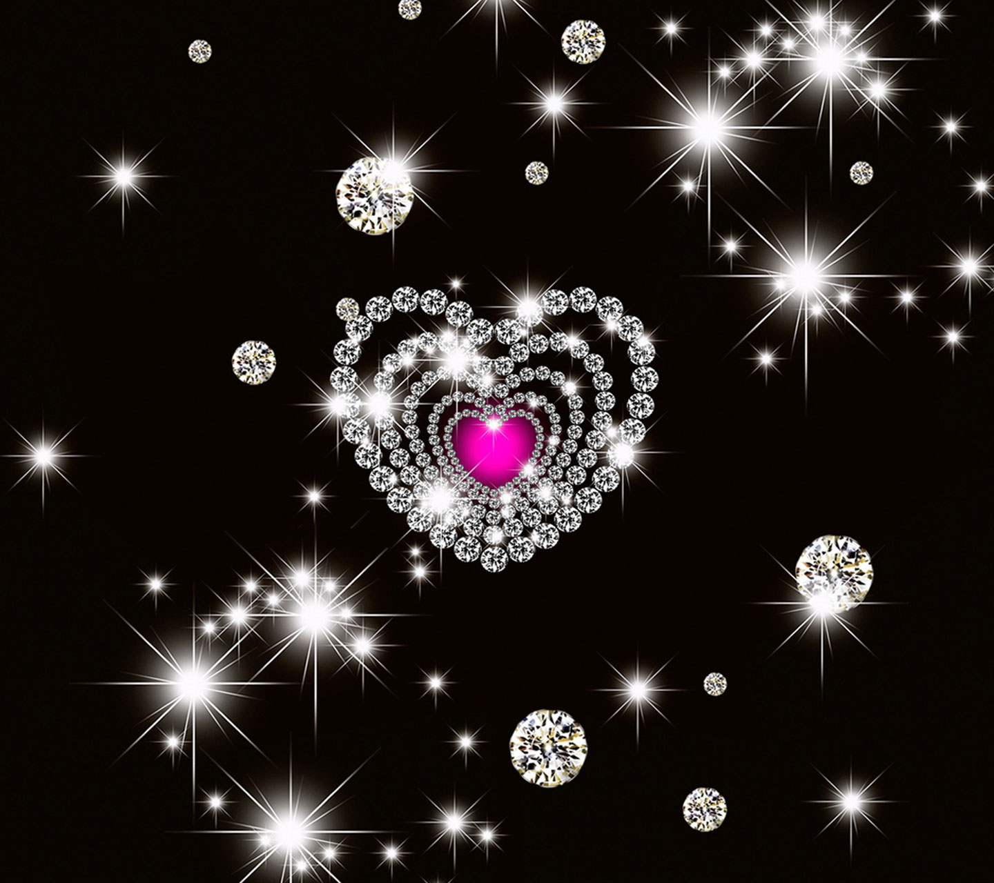 Description: A heart surrounded by diamonds and stars on a black background with a pink center surrounded by smaller diamonds and stars.