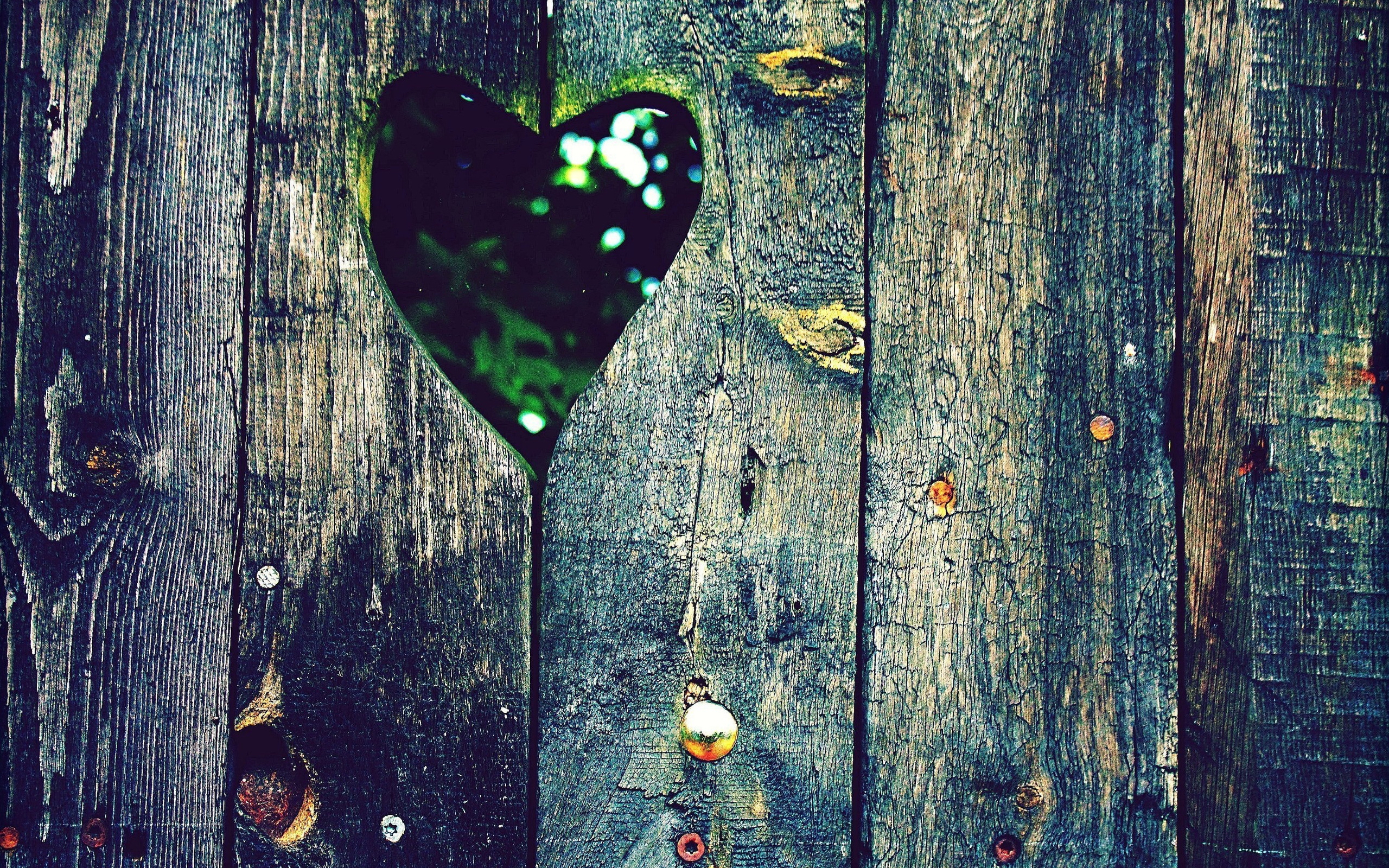 Description: A heart shaped hole in a wooden fence with a hole in the middle of it that is cut into the wood.