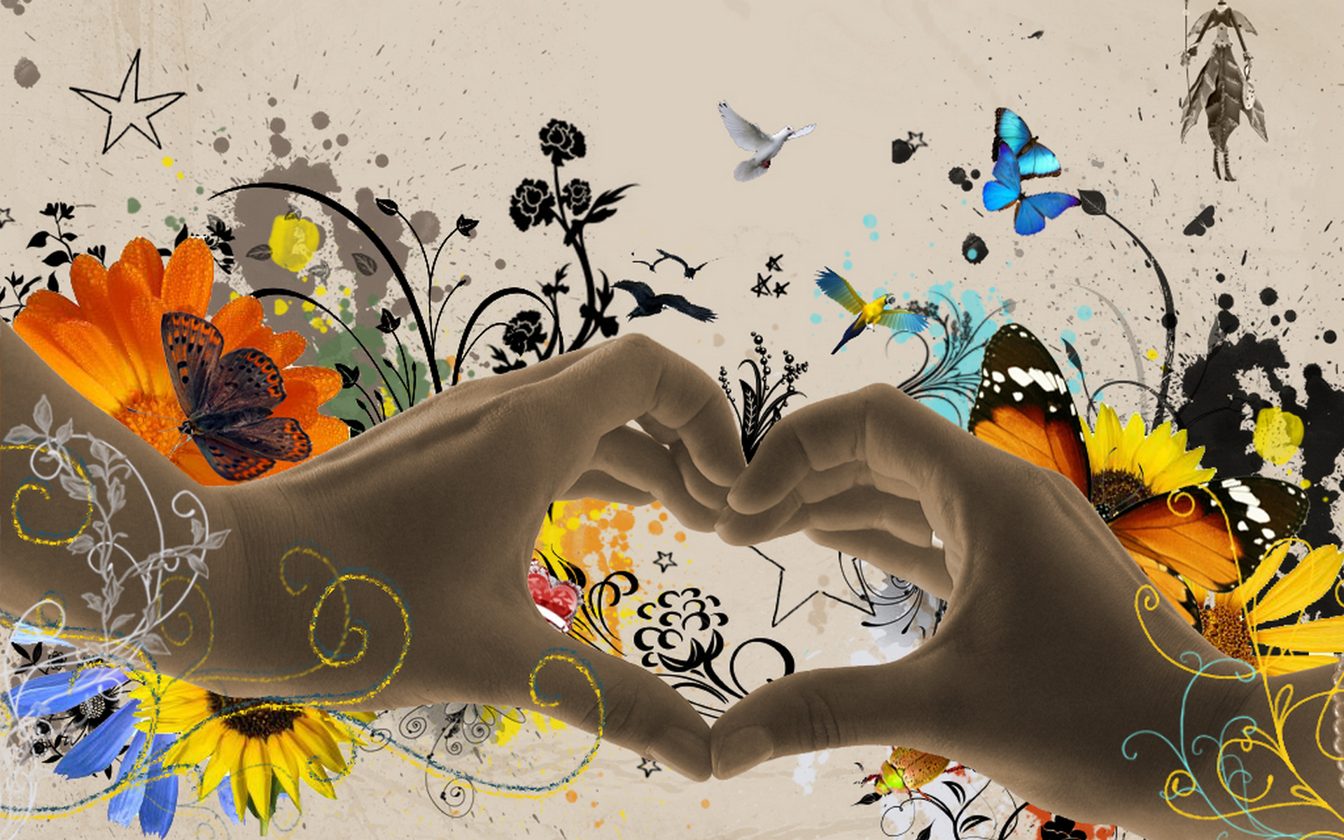Description: A person making a heart with their hands and flowers and butterflies around them on a white background with a butterfly and flower border.