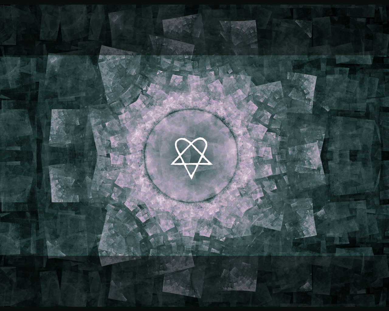 Description: A picture of a heart and two intertwined hearts in a circle of squares and squares of varying sizes.