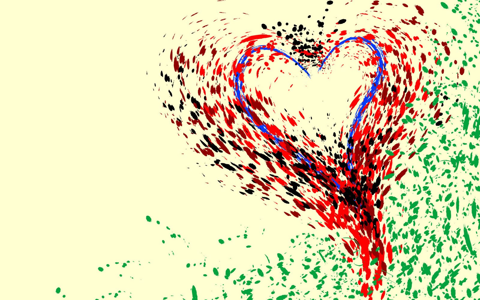 Description: A heart shaped object is shown in a painting style with colors and splatters on it.
