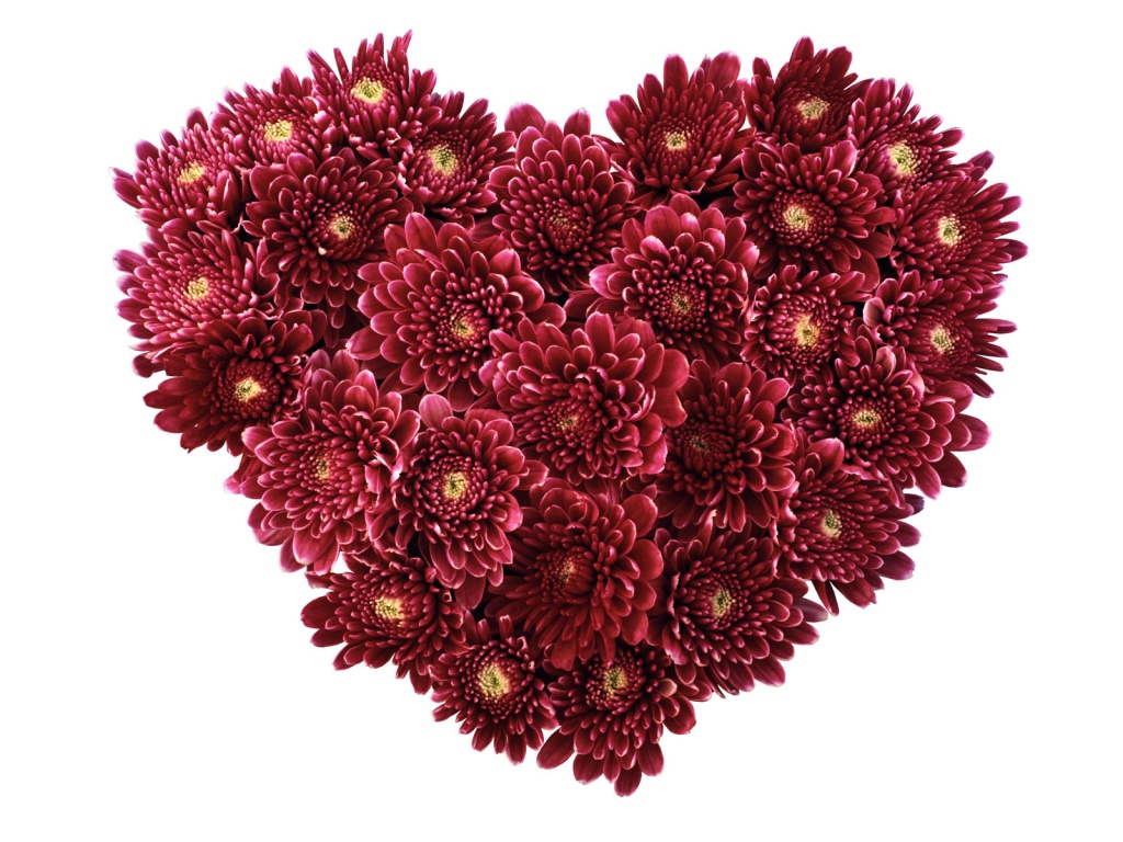 Description: A heart shaped arrangement of red flowers on a white background with a gold center piece in the center of the heart.