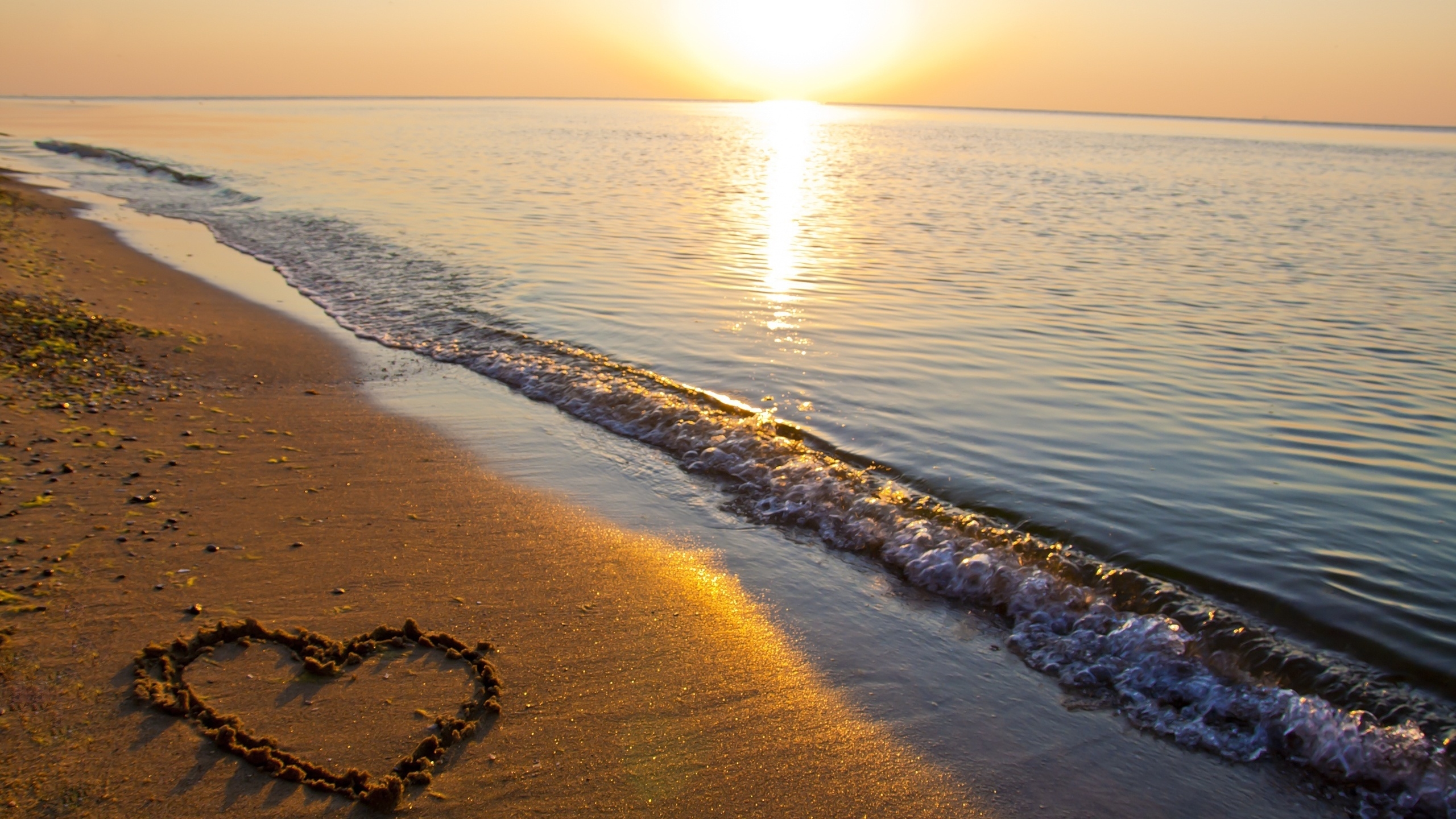 Description: A heart drawn in the sand on a beach at sunset with the sun in the background and a wave coming in.