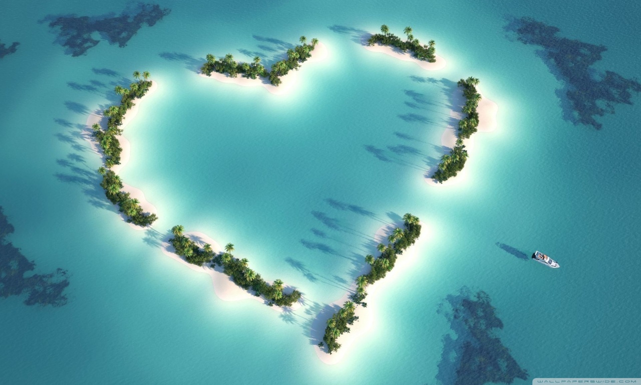 Description: A heart shaped island with a boat in the water and a boat floating in the water in the middle.