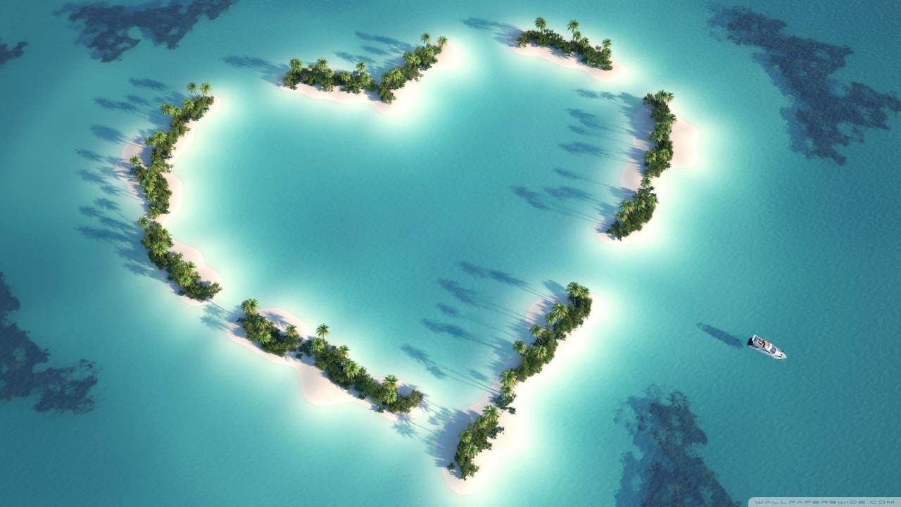 Description: A heart shaped island with a boat in the water and a boat floating in the water in the middle.