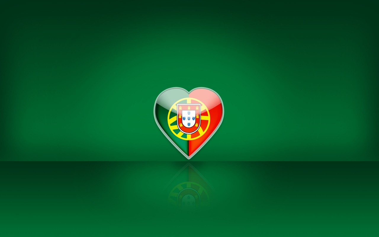 Description: A heart shaped portugal flag on a green background with a reflection of the flag in the center of the heart.