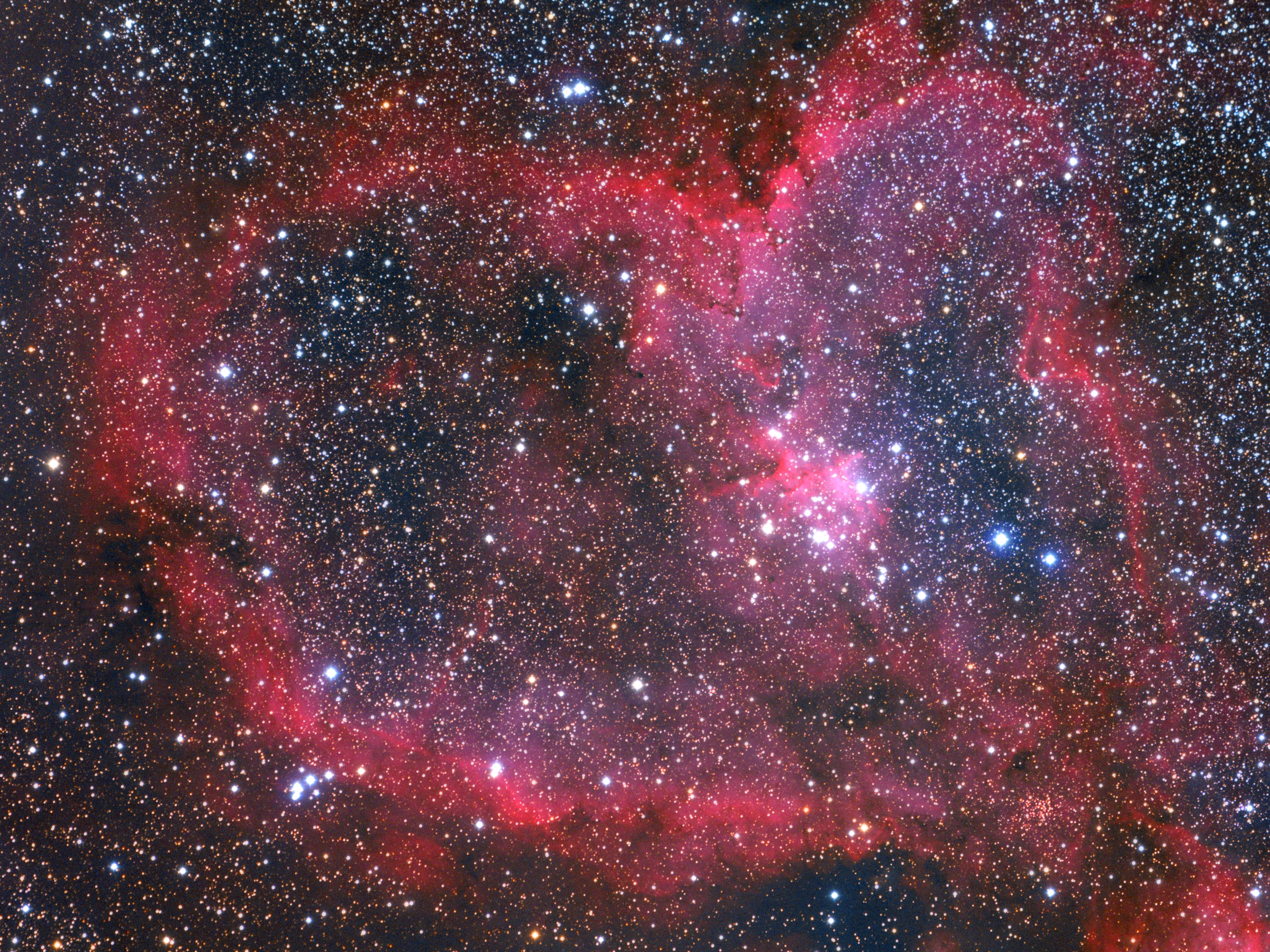 Description: A heart shaped object in the middle of a star field with stars in the background and a red star in the middle of the picture.