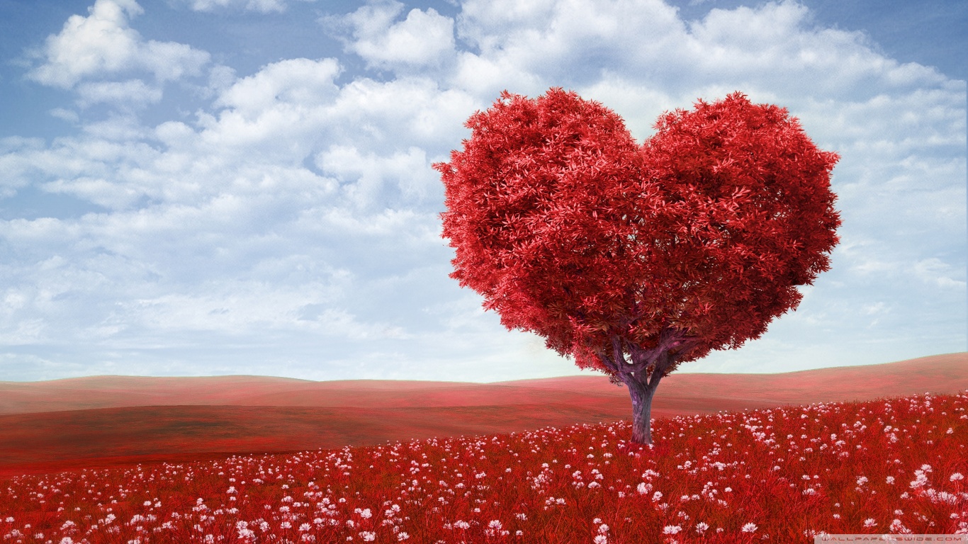 Description: A heart shaped tree in a field of flowers with a blue sky background and clouds above it.