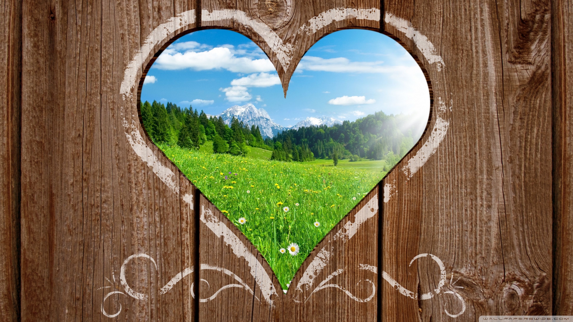 Description: A heart shaped window with a field of grass and trees in the background with a sky and clouds in the center.