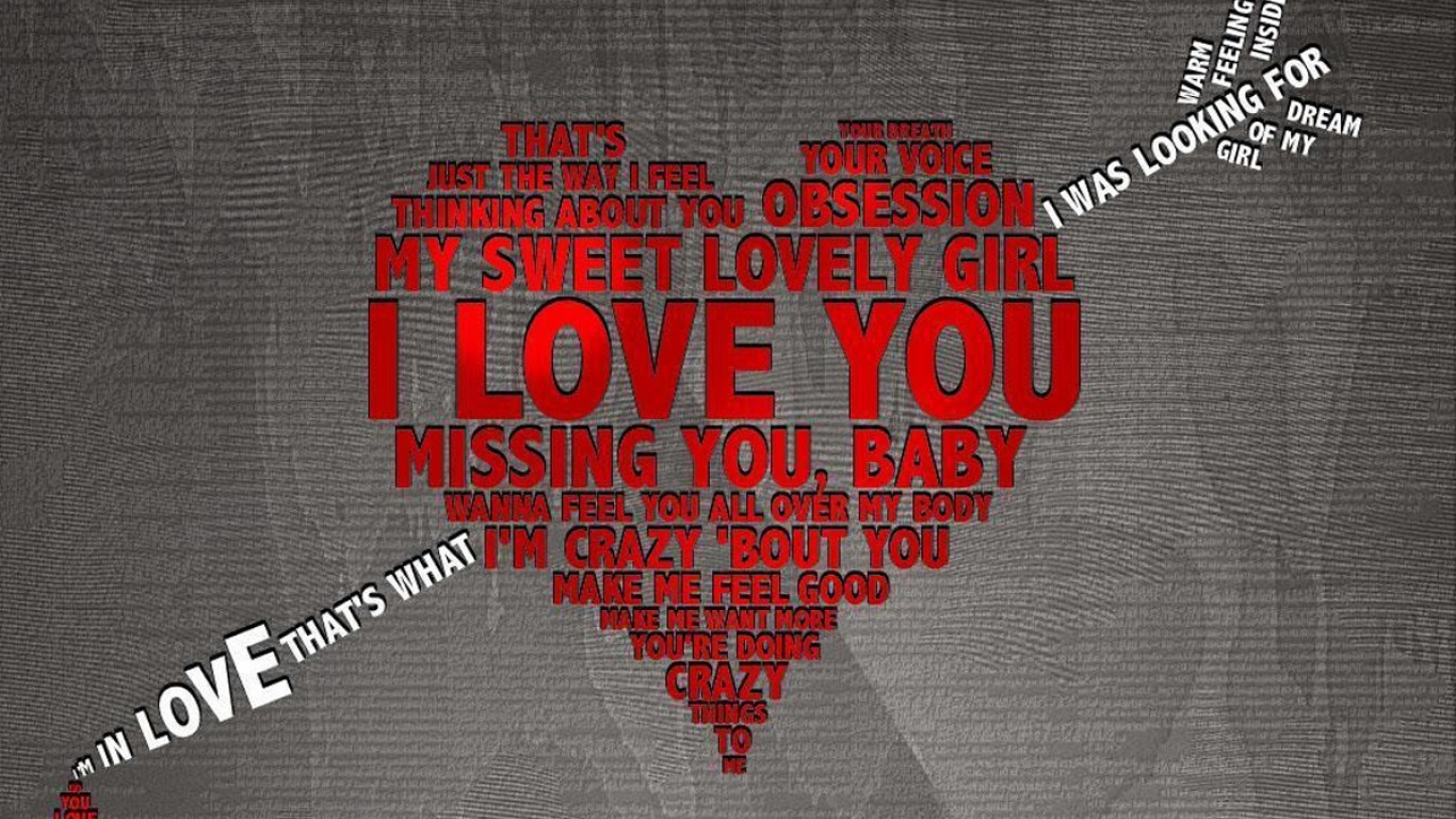 Description: A heart shaped word art with words written in it and a red heart on the side of the word.