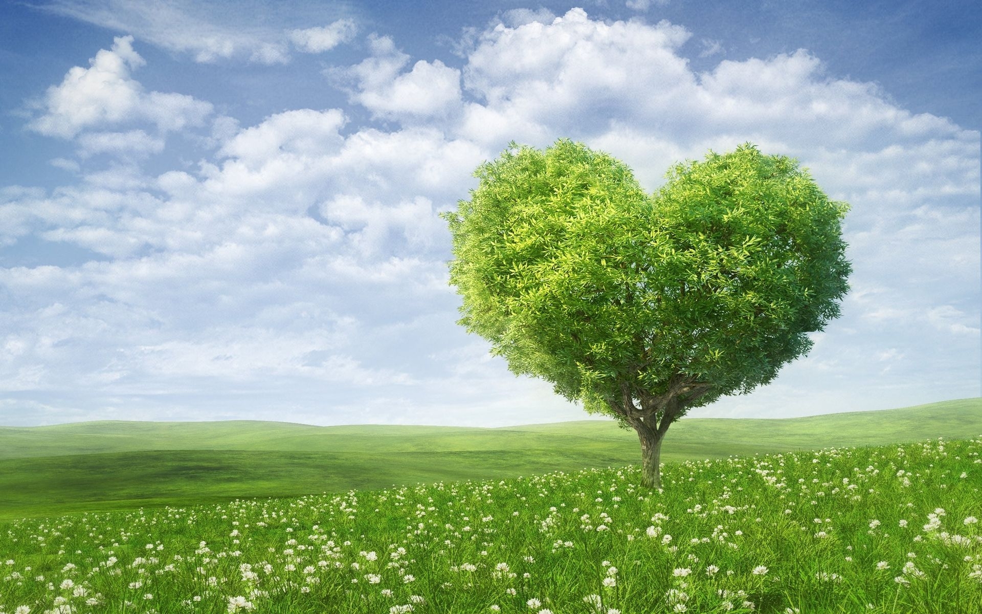 Description: A heart shaped tree in a field of grass and flowers with a blue sky in the background with clouds.