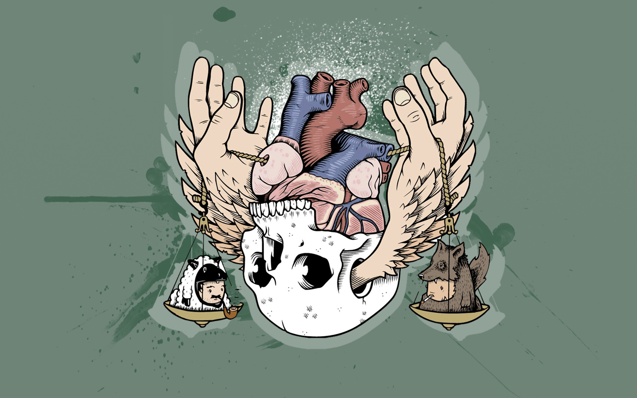 Description: A drawing of a human heart with wings and a skull with a human head on it's back.