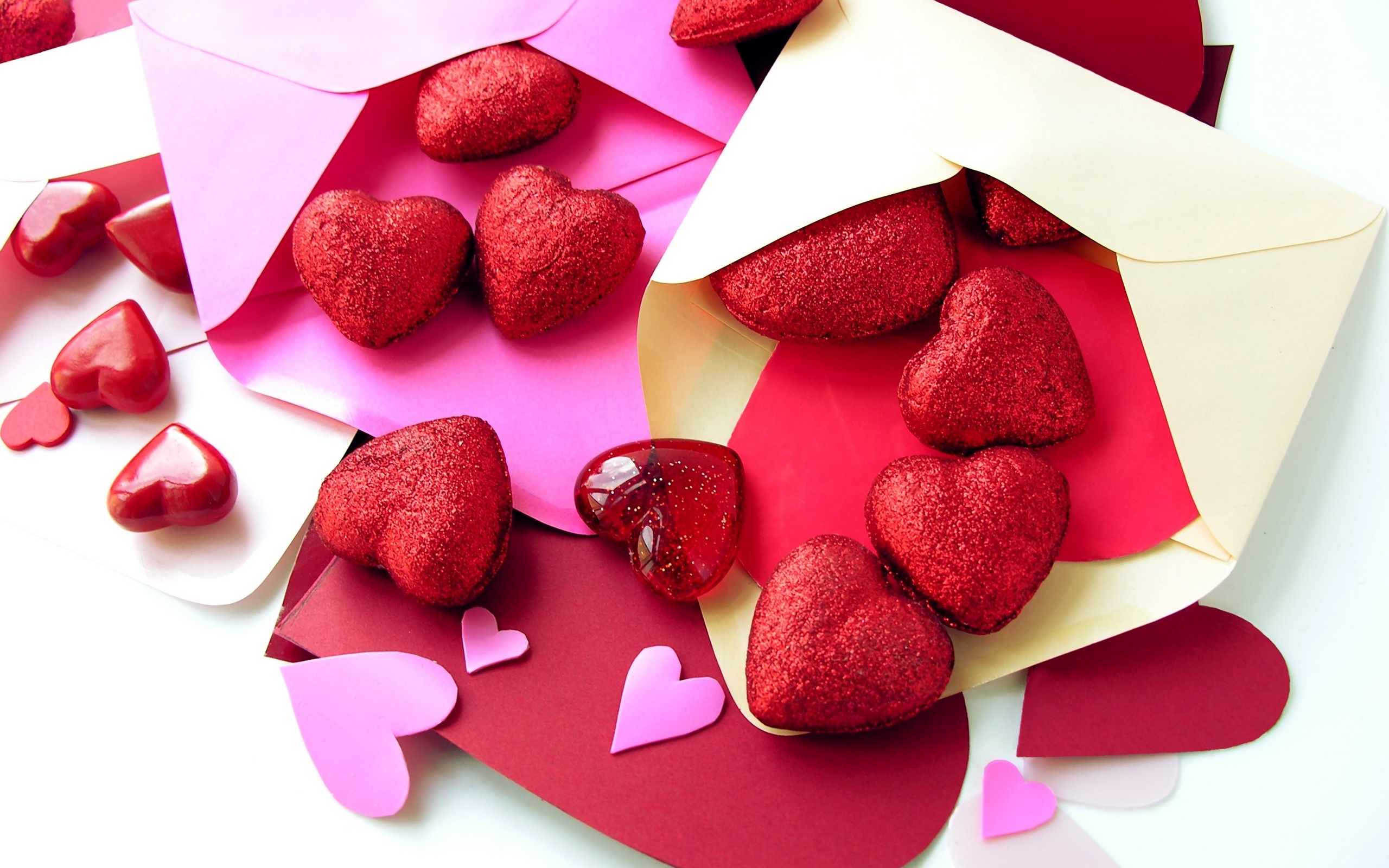 Description: A bunch of hearts are on a table with paper hearts and envelopes on it.