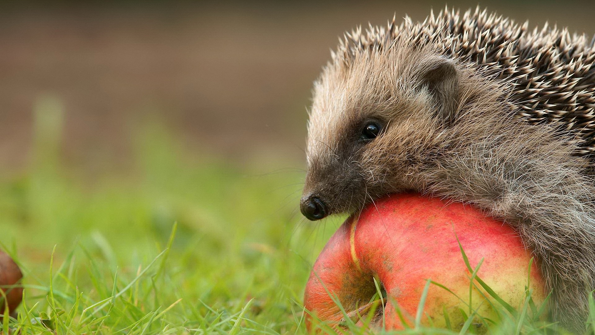 Description: A hedgehog is holding an apple in its mouth in the grass.