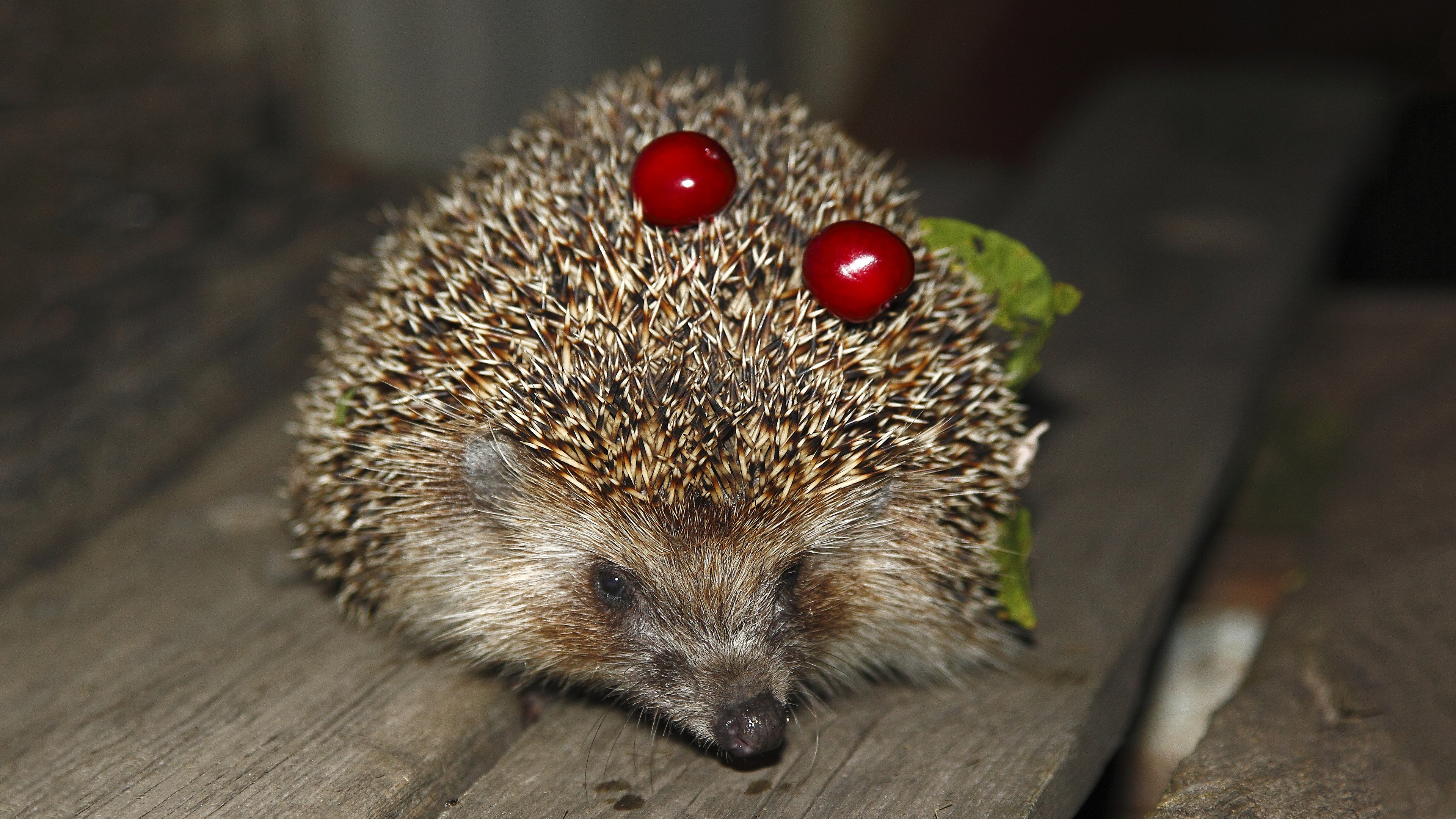 Description: A hedgehog with two cherries on its head sitting on a wooden surface with leaves and a piece of wood.