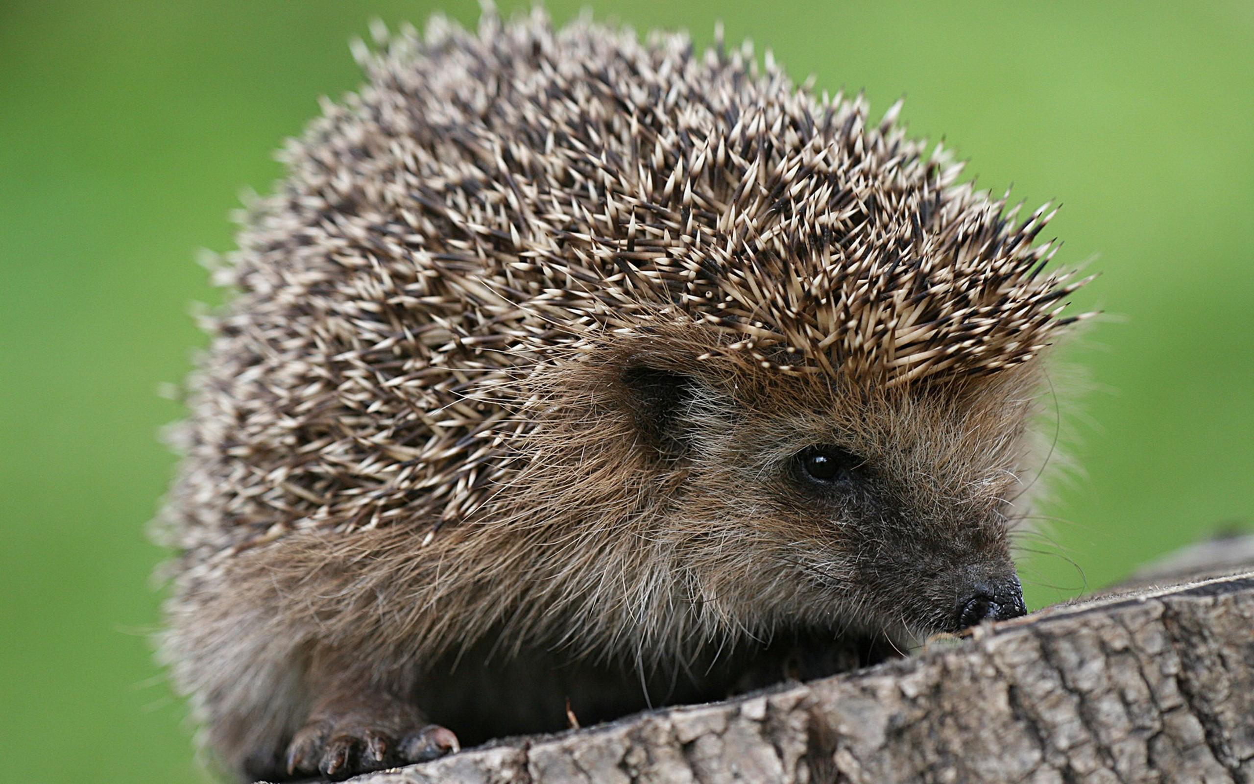 Description: A hedgehog is sitting on a tree trunk and looking at the camera with a sad look on its face.