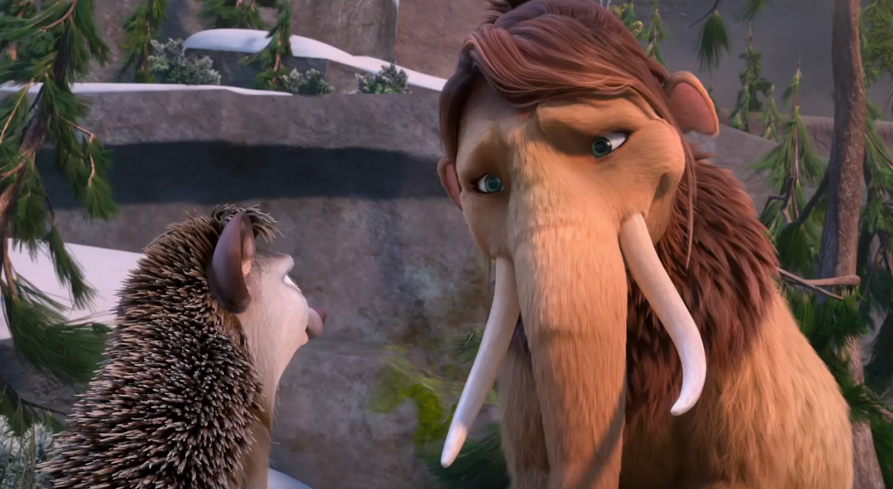 Description: A hedgehog and a walong are in a scene from the animated movie ice age dawn of the dinosaurs.