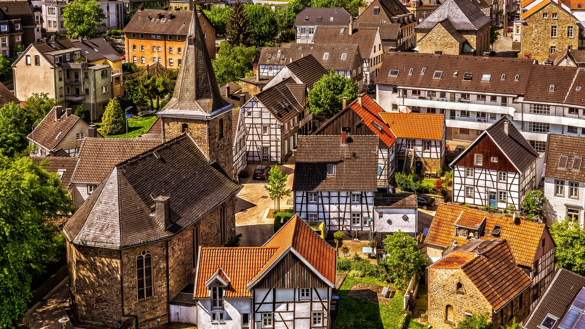 Description: A city with many buildings and trees in the background and a hill in the foreground with a few buildings on it.