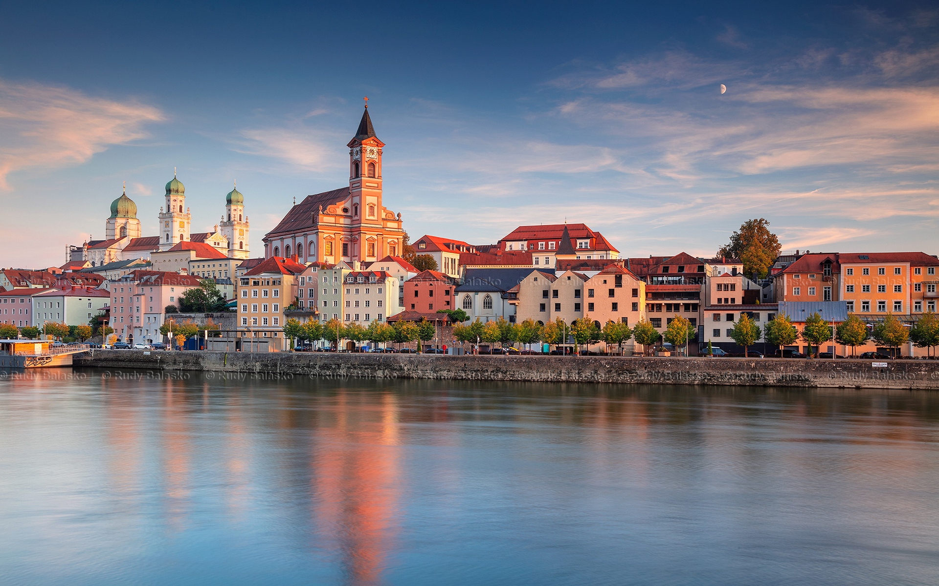 Description: A city with a river running through it and a church tower in the background with a full moon in the sky.