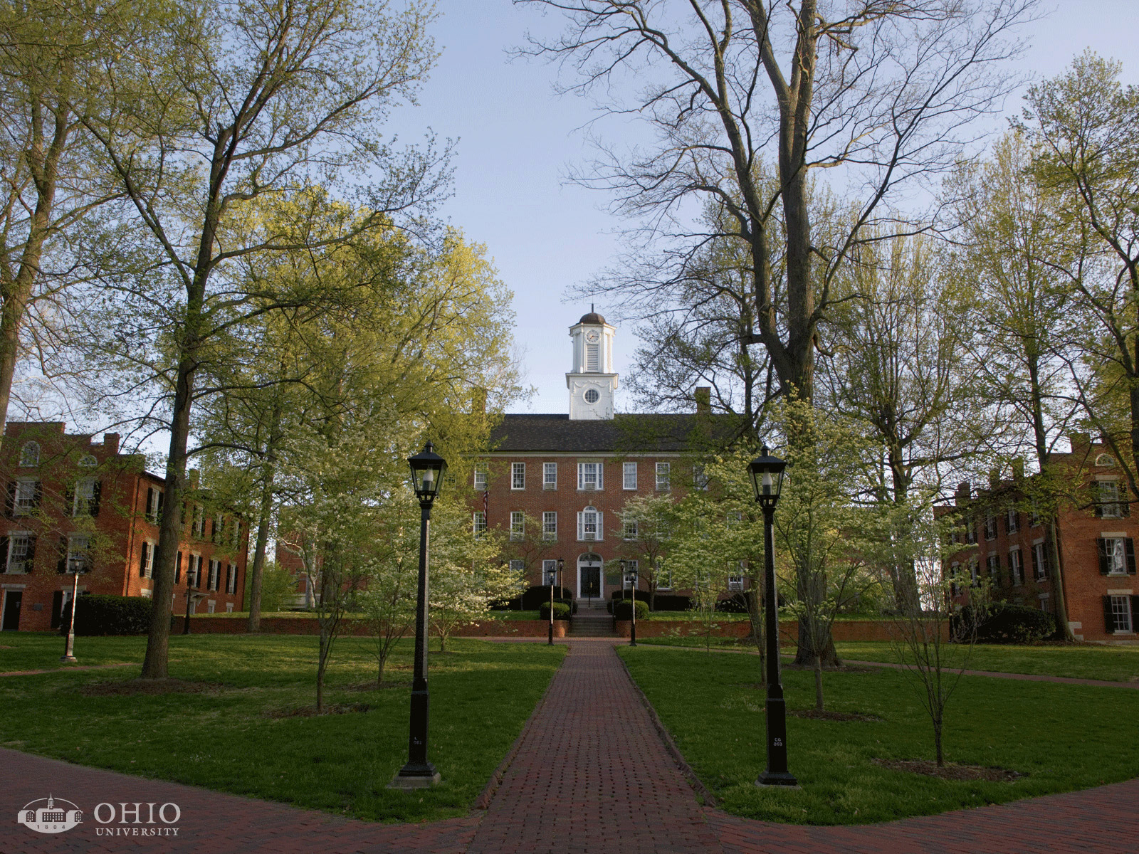 Description: A brick walkway leads to a building with a clock tower in the background and trees lining the walkway in front of it.