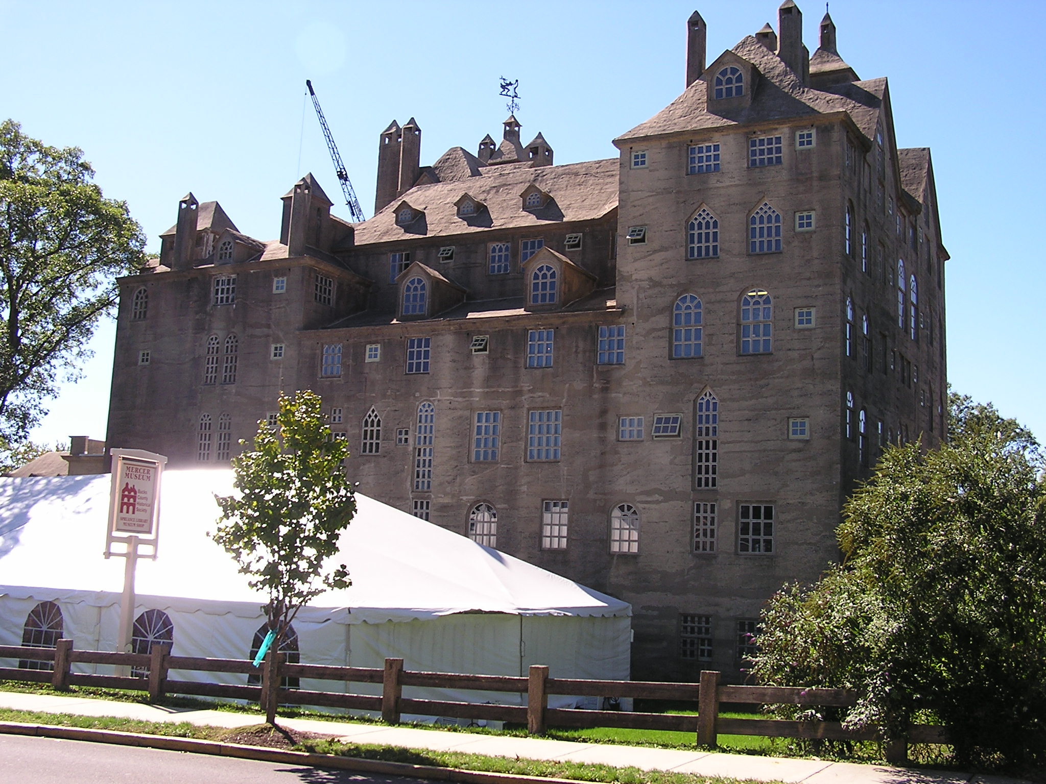 Description: A large building with a tall tower and a white tent in front of it on a street corner with a tree.