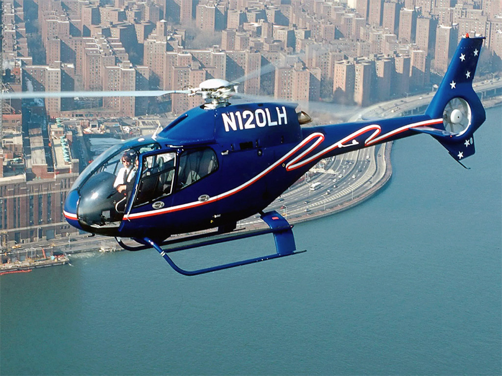 Description: A helicopter flying over a city with a bridge in the background and a helicopter in the air above the water.