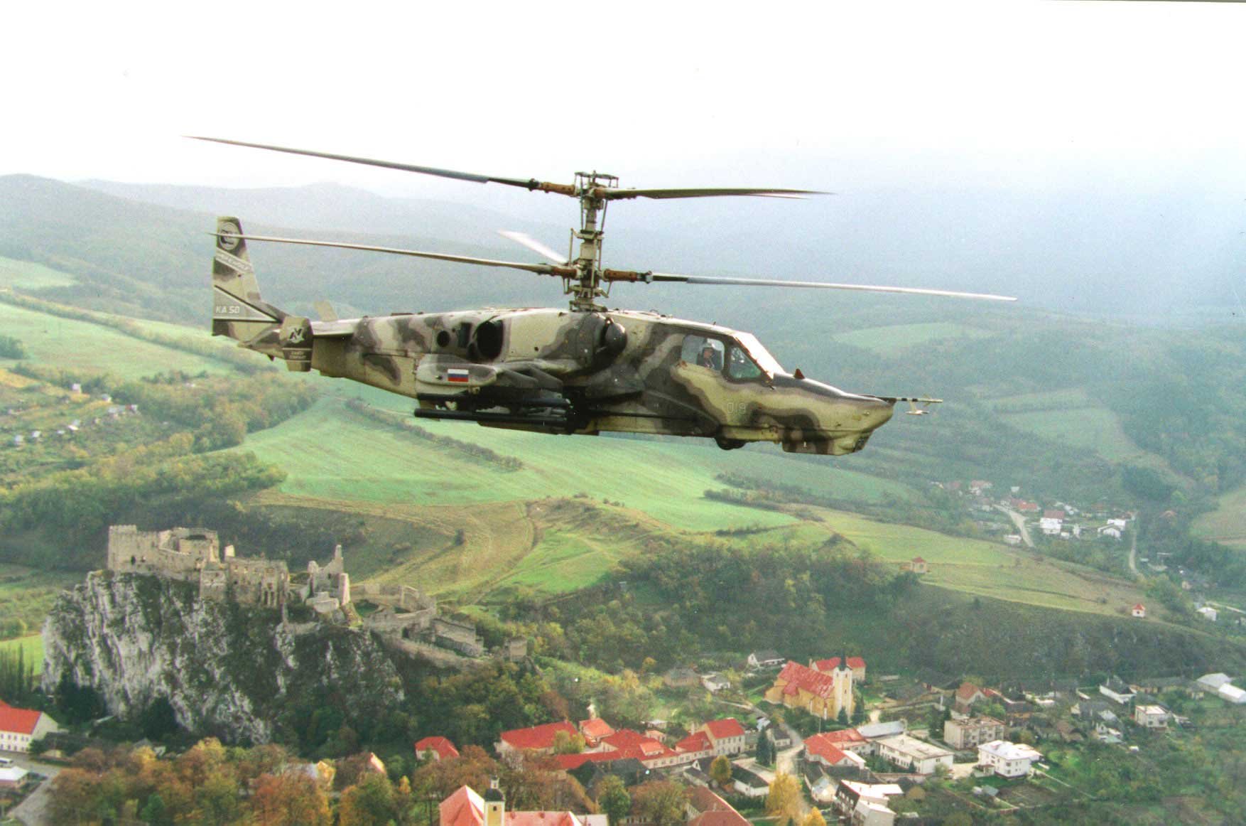 Description: A helicopter flying over a city with a castle in the background and a town below it with a red roof.