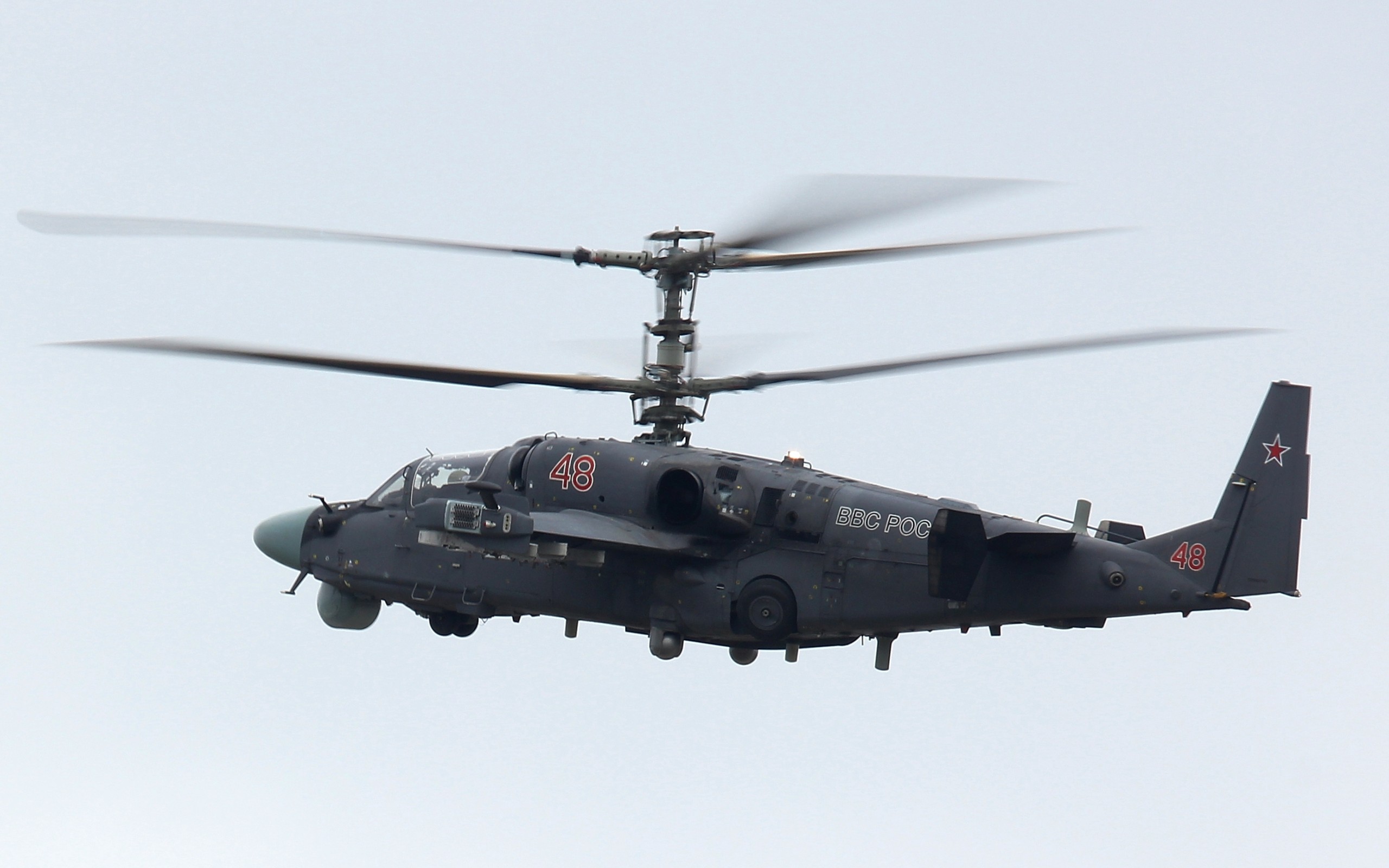 Description: A helicopter flying through a gray sky with propellers on it's wings and a red and white logo on the front of the helicopter.