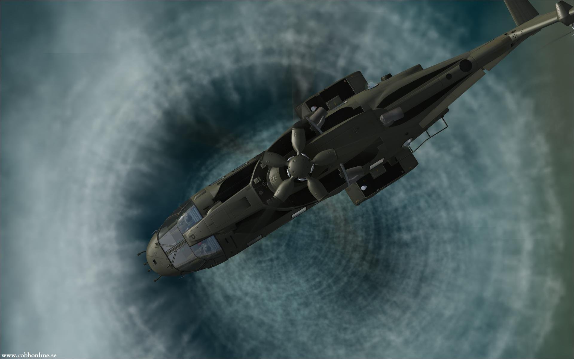 Description: A computer generated image of a helicopter flying over a blue ocean with a circular design in the background and a black jet.
