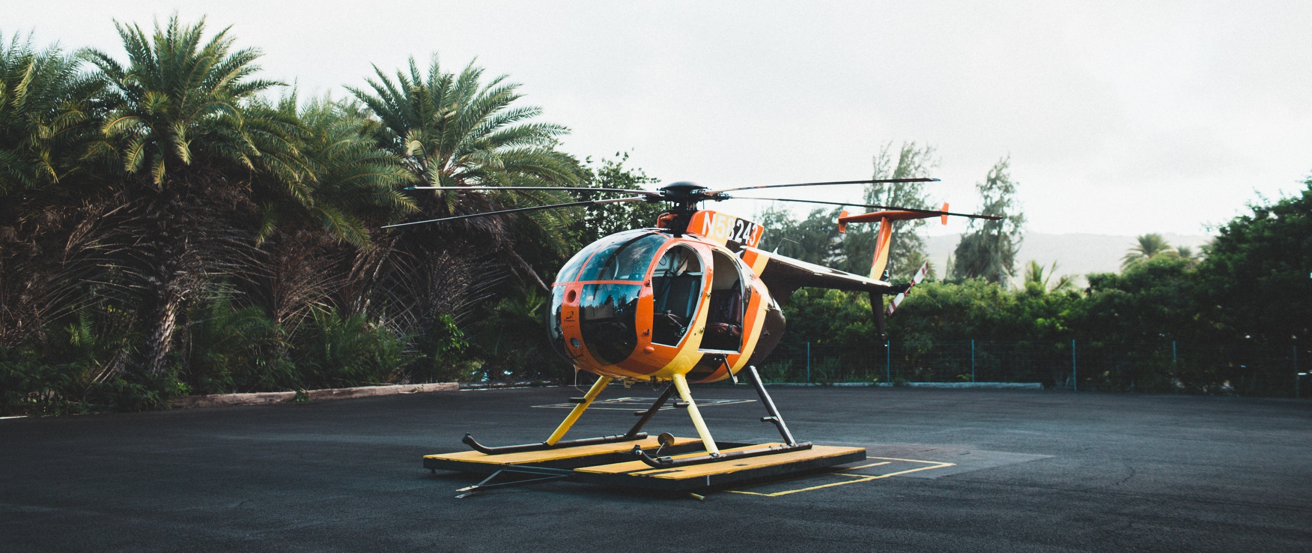Description: A helicopter sitting on top of a parking lot next to a forest of trees and bushes on a cloudy day.