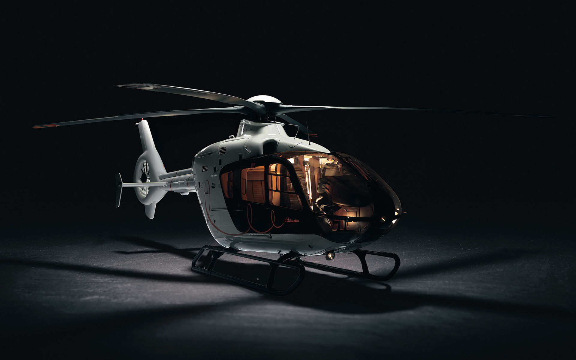 Description: A helicopter with a pilot inside of it on a dark background with a shadow from the front of the helicopter.