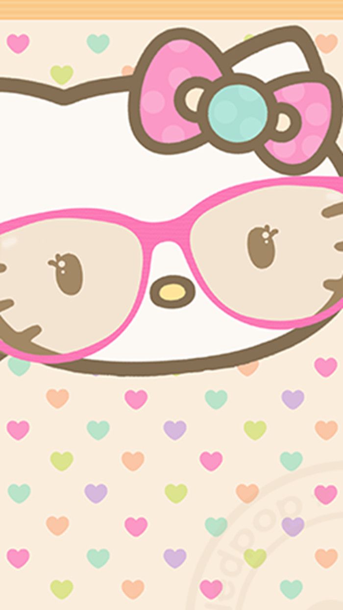 Description: A hello kitty wallpaper with hearts and a bow on it's head and a hello kitty wearing glasses.