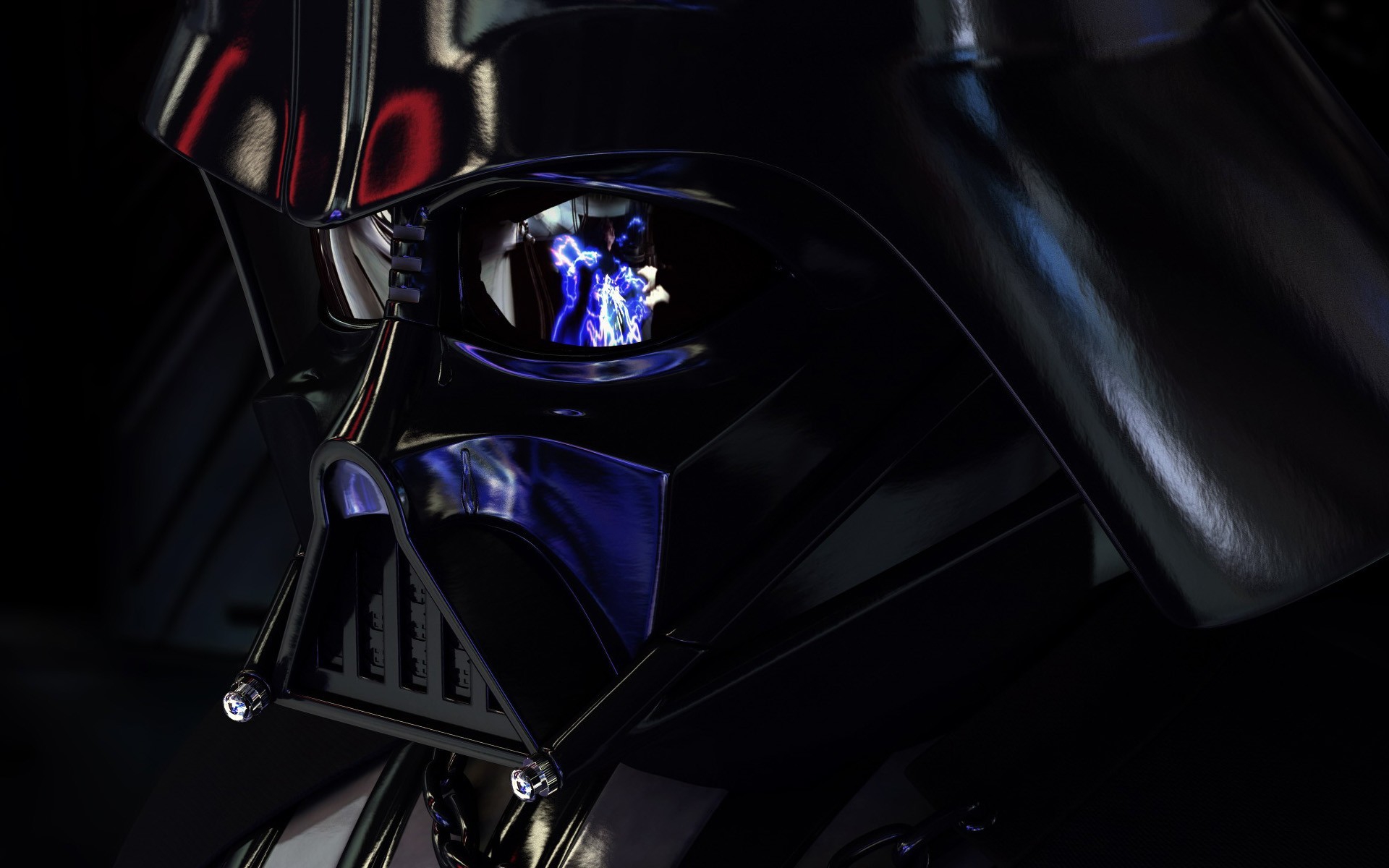 Description: A helmet with a blue light on it is shown in the dark room of a star wars themed room.