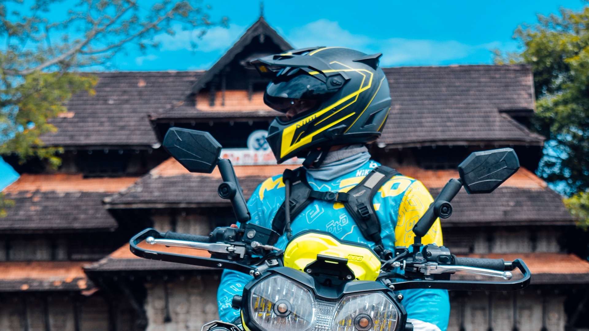 Description: A person in a helmet and blue outfit on a motorcycle with a helmet on and a yellow and black outfit.