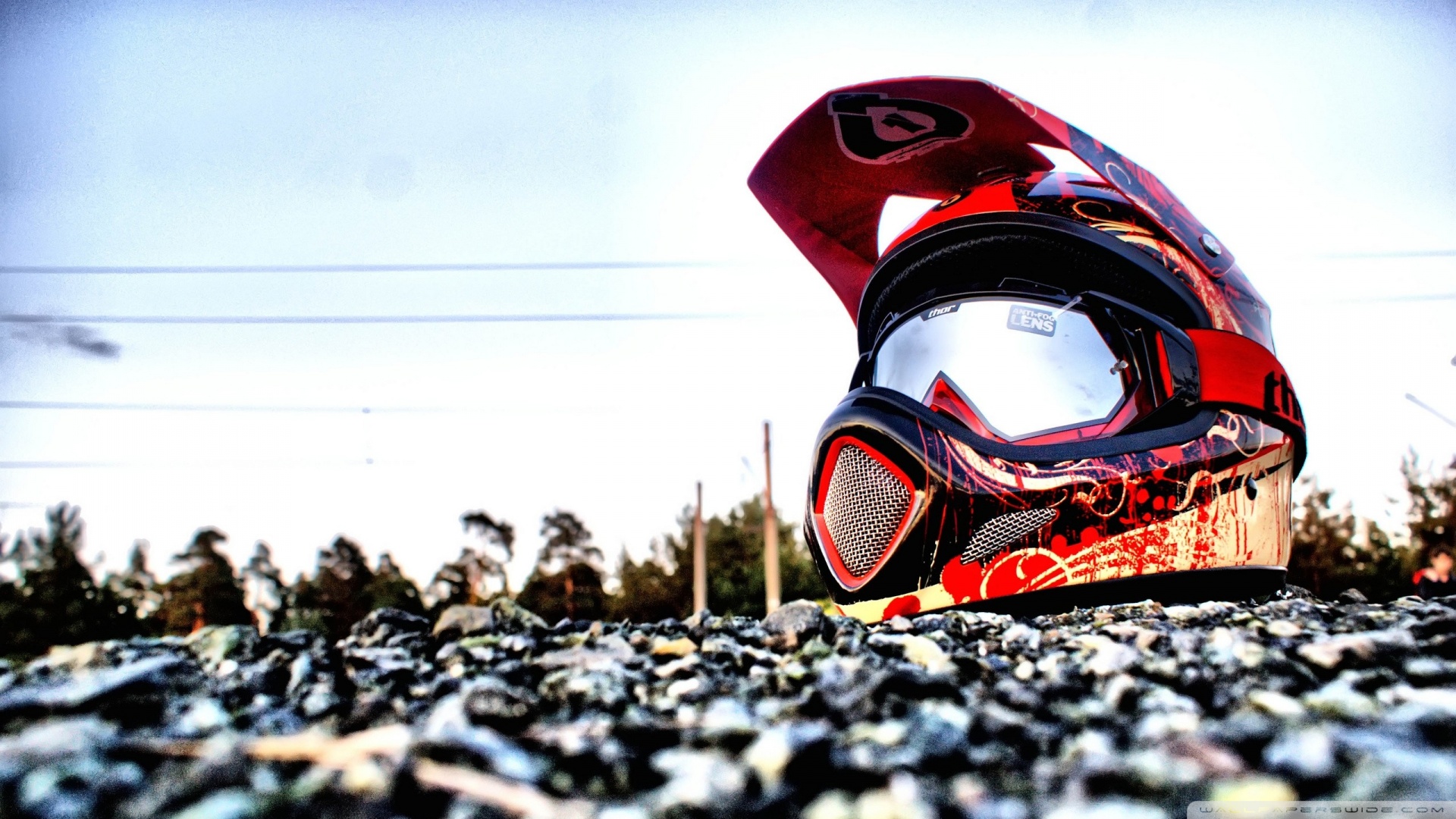 Description: A helmet is sitting on a pile of rocks and gravel with a sky background behind it and a few trees.