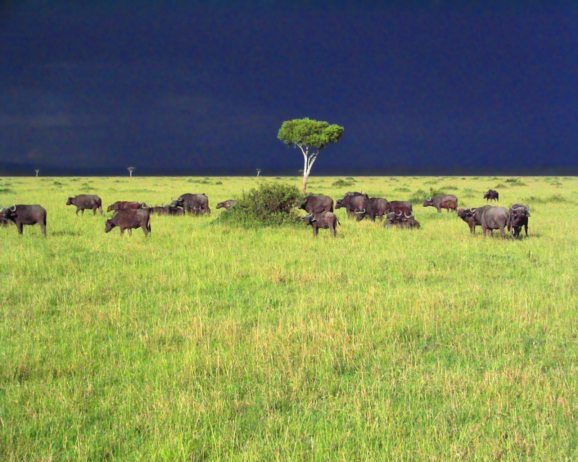 Description: A herd of cattle grazing on a lush green field under a dark sky with clouds in the distance and a lone tree in the foreground.