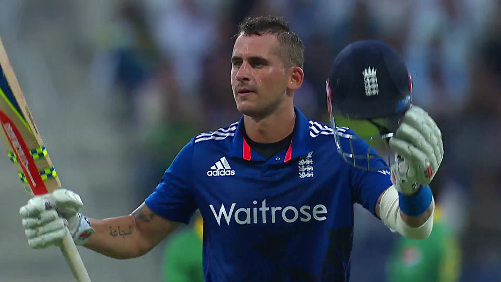 Description: A man holding a bat and helmet in his hands while wearing a blue shirt and white gloves and holding a black helmet.