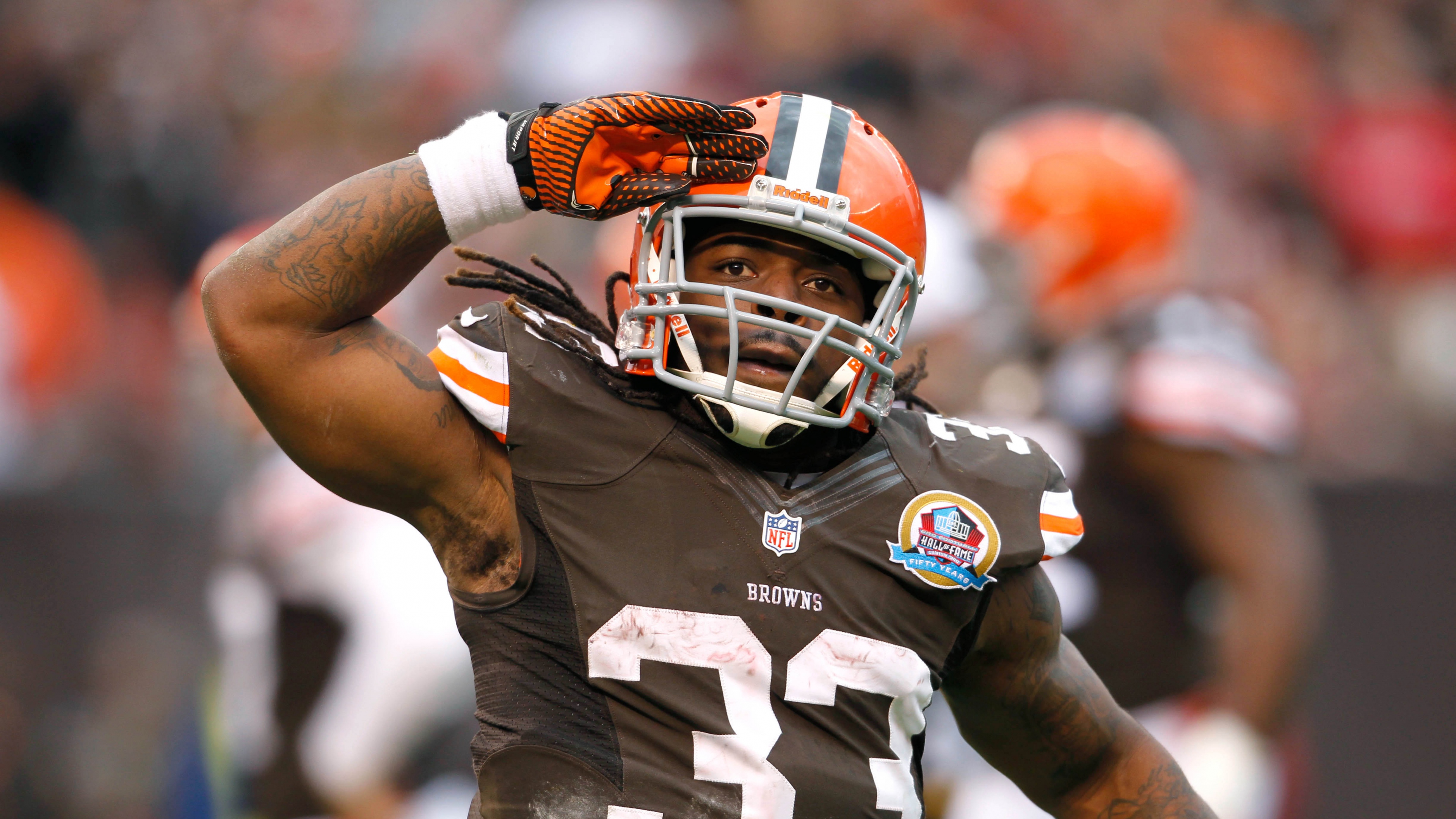 Description: A football player is holding his head in his hands and is looking at the camera with a serious look on his face.