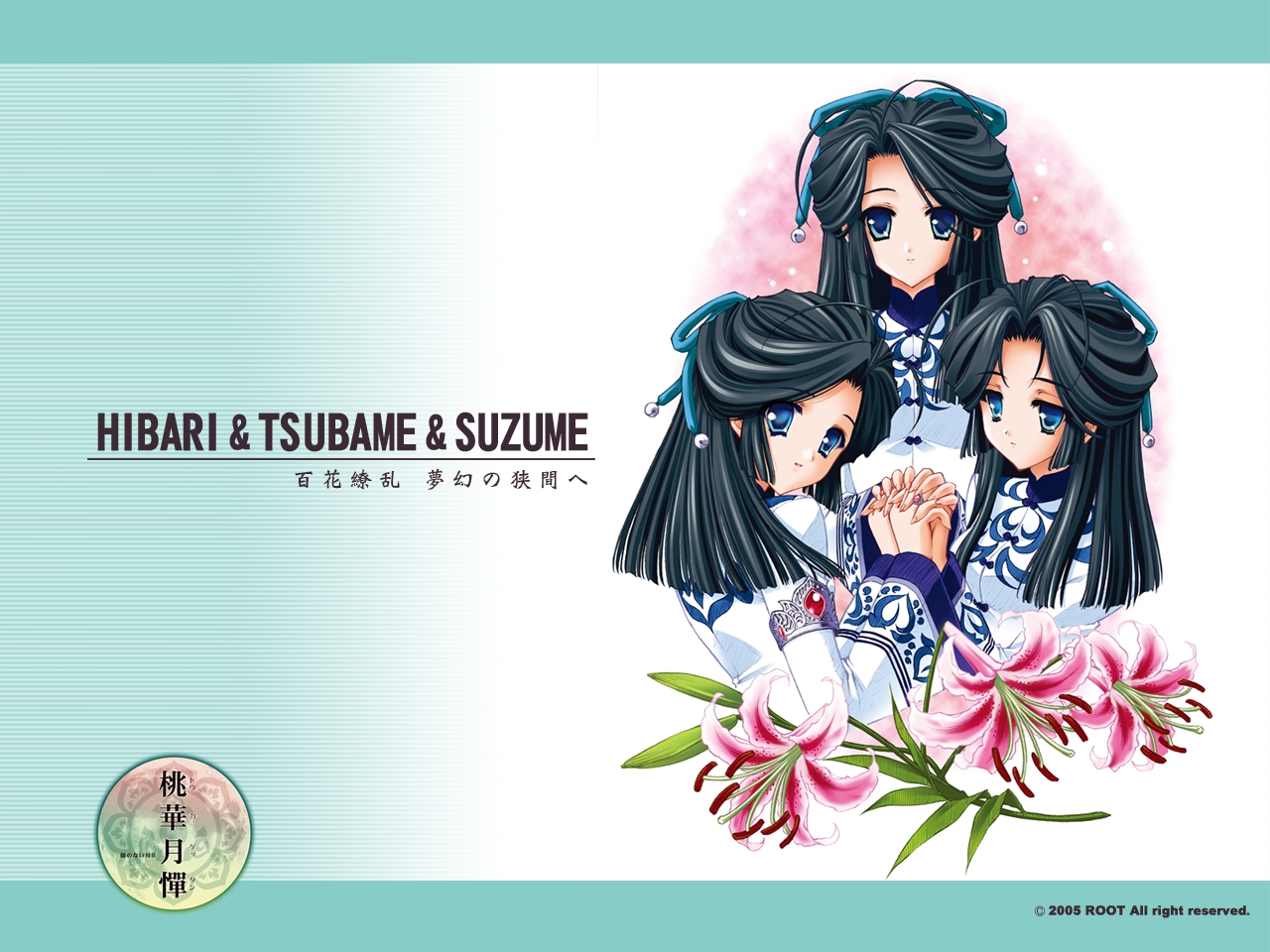 Description: A picture of three women with long hair and flowers in front of a blue background with the words hibari & tsubime & suzume written in english.