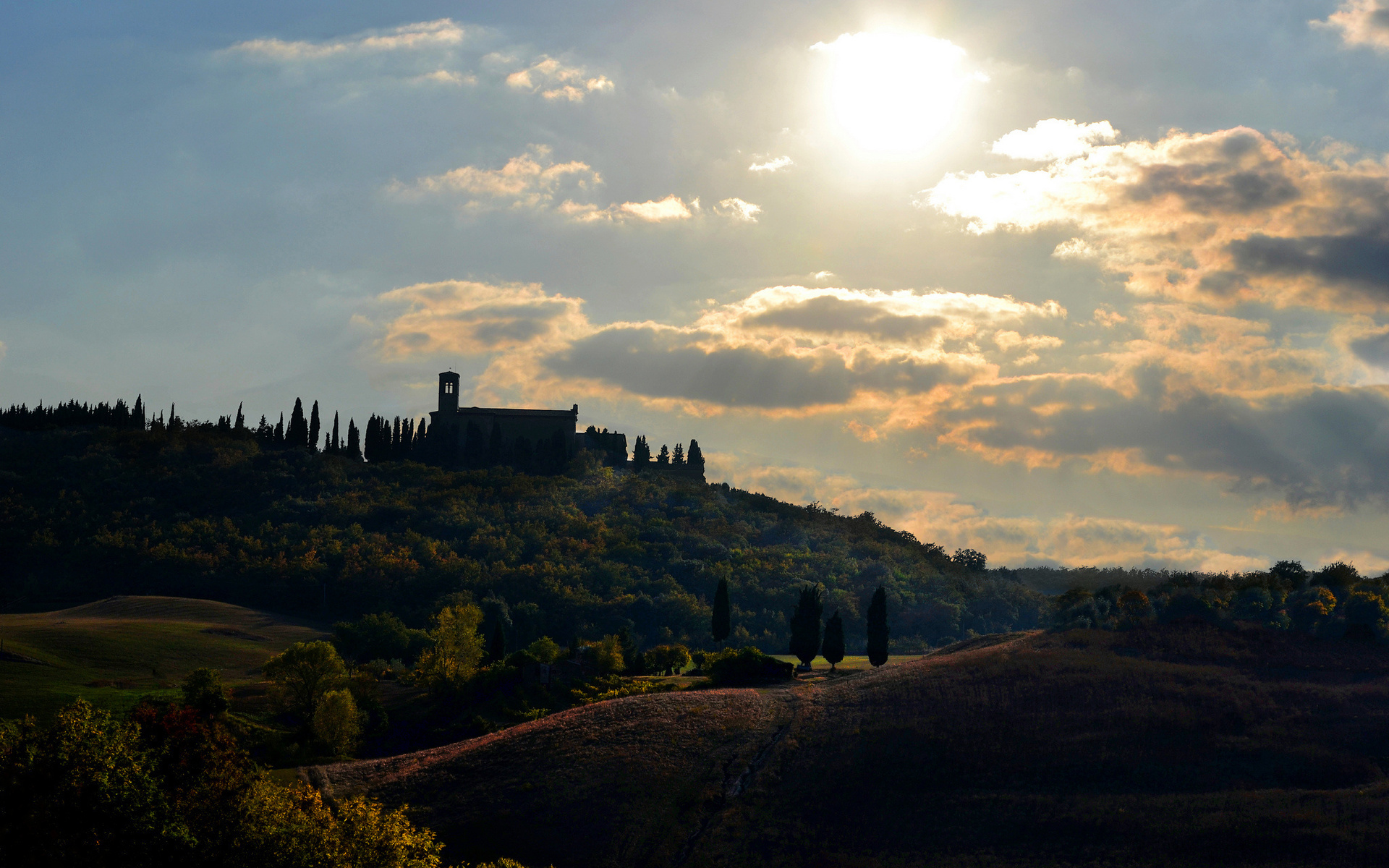 Description: A hill with a church on top of it under a cloudy sky with sun shining through the clouds above.