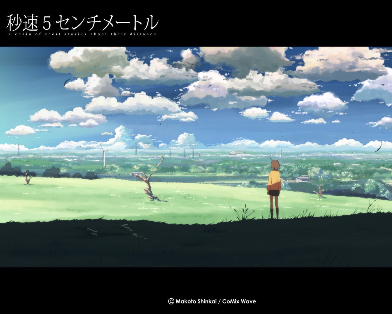 Description: A person standing on a hill looking at a field with clouds in the sky above them and a person standing on a hill looking at a field with a kite.