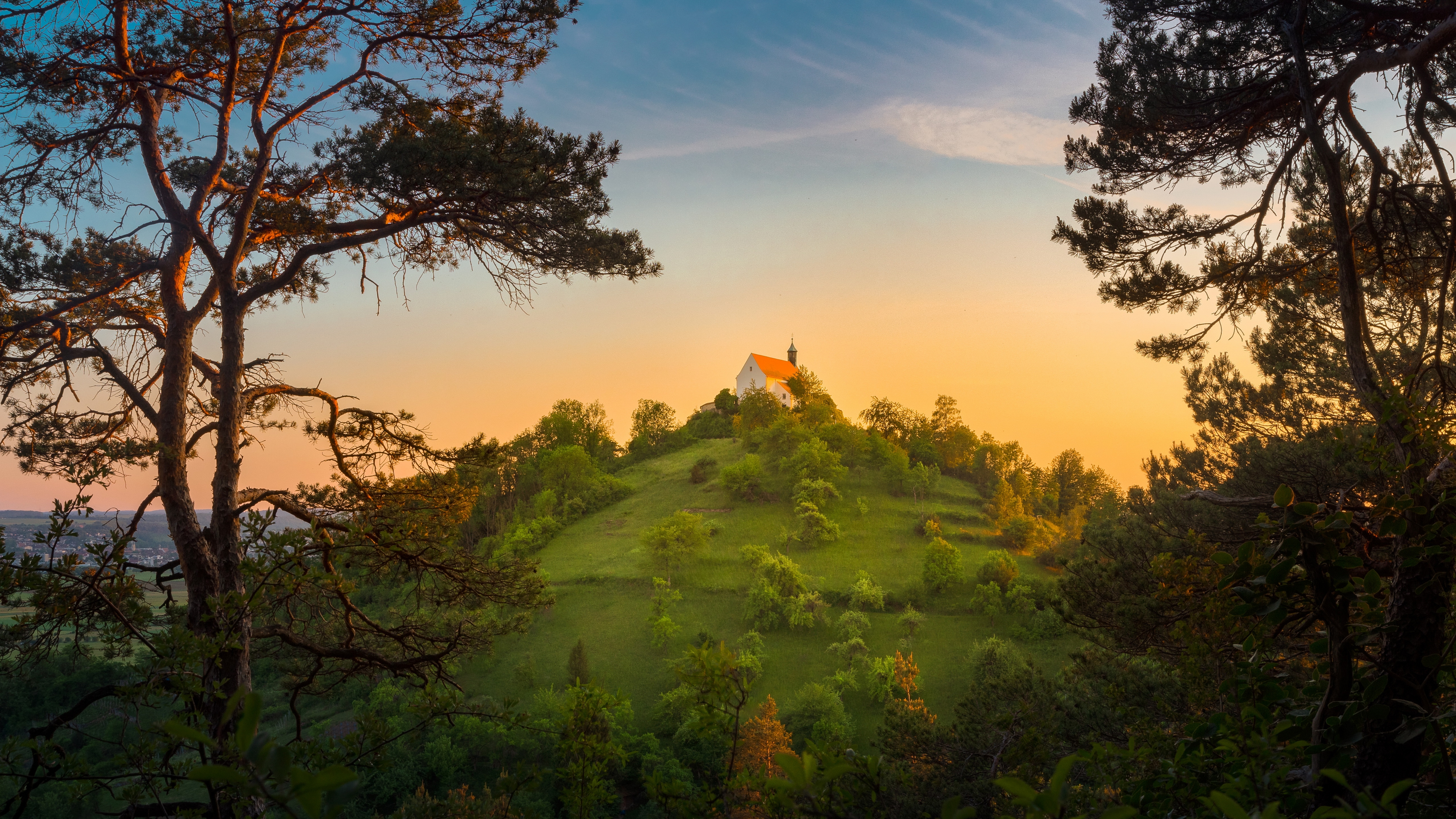 Description: A hill with a flag on top of it surrounded by trees and bushes at sunset or dawn with a bright orange sky.
