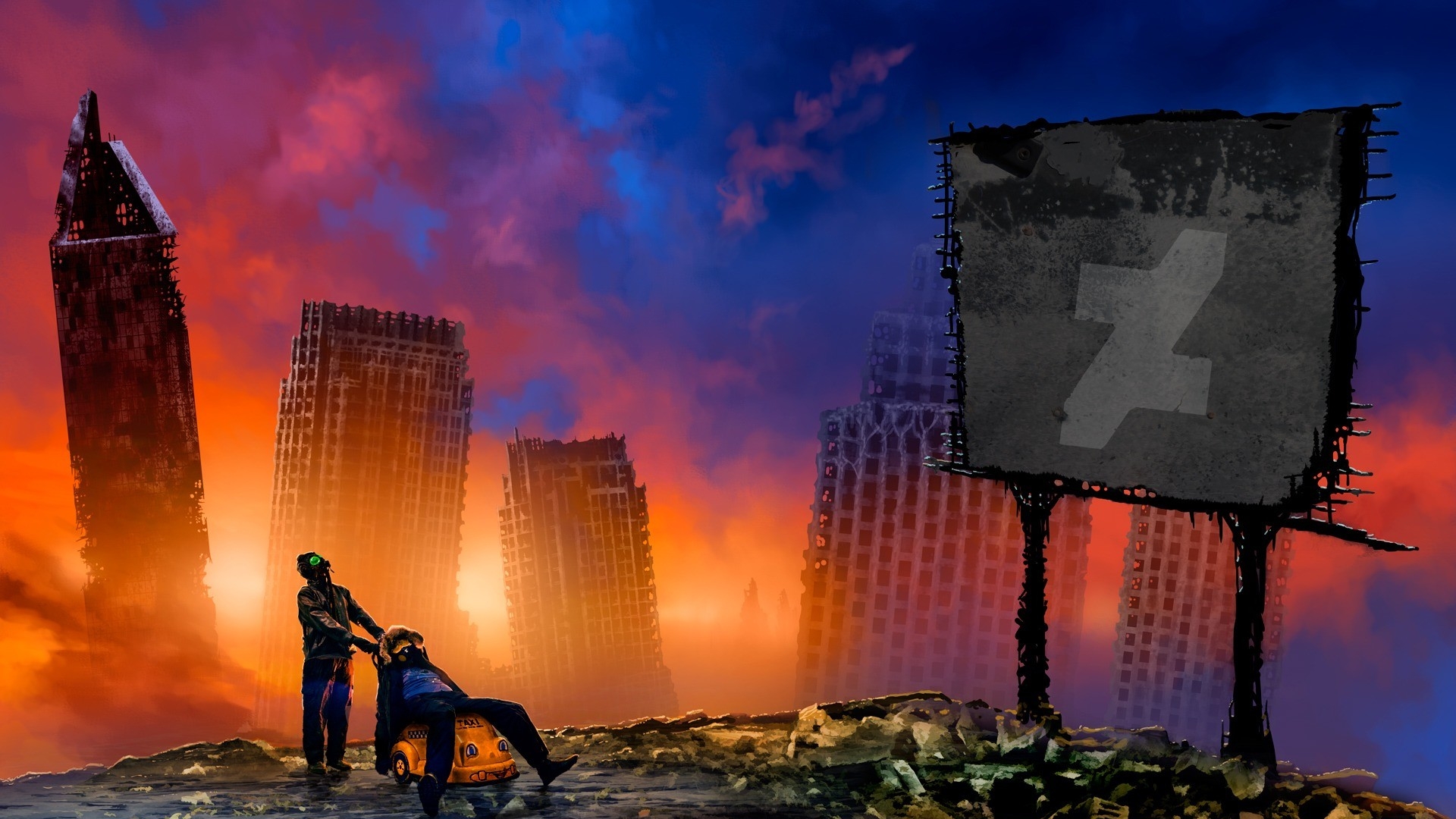Description: A painting of two people standing on a hill with a city in the background and a sign in the foreground.