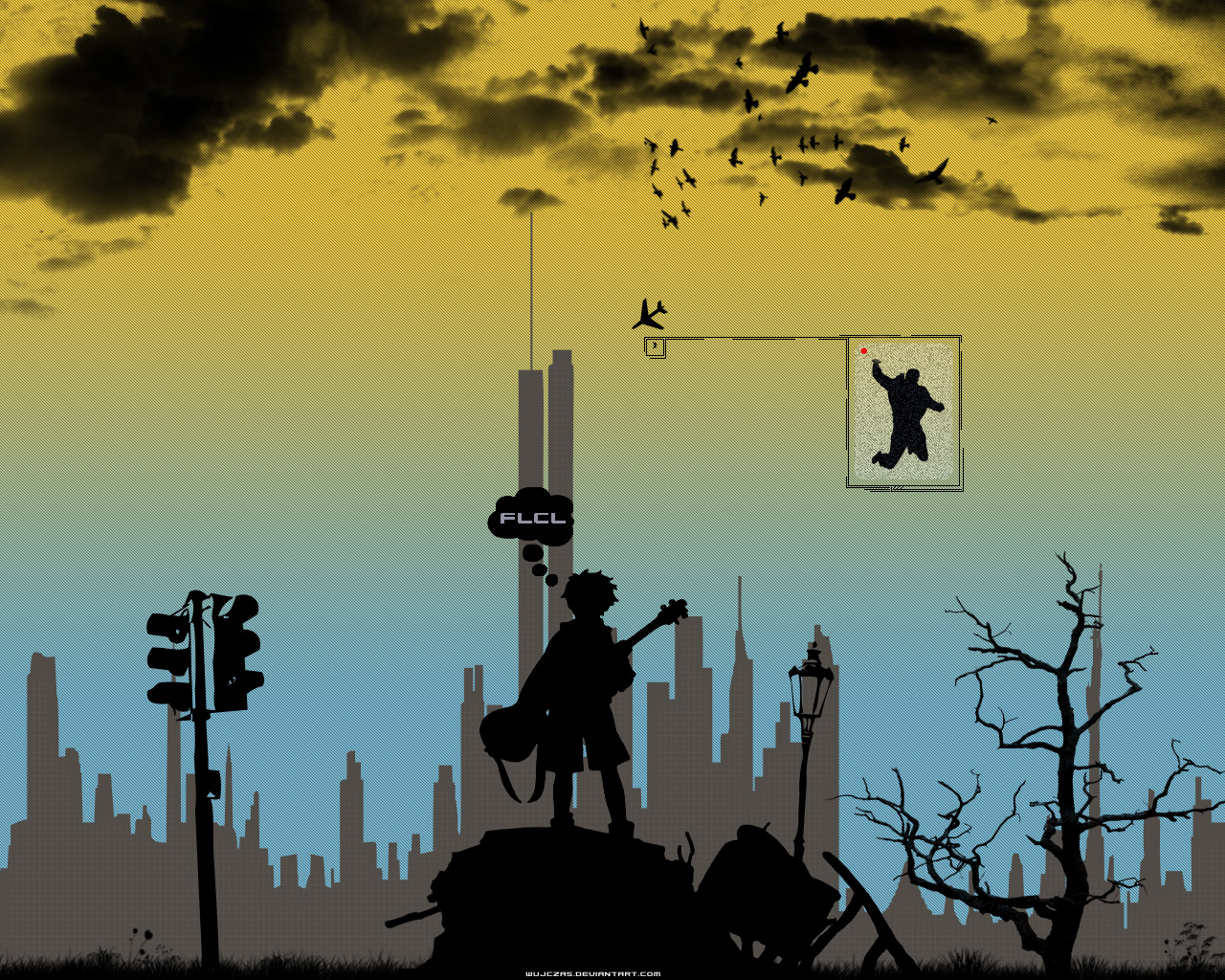 Description: A person standing on a hill with a guitar in his hand and a city in the background with birds flying overhead.