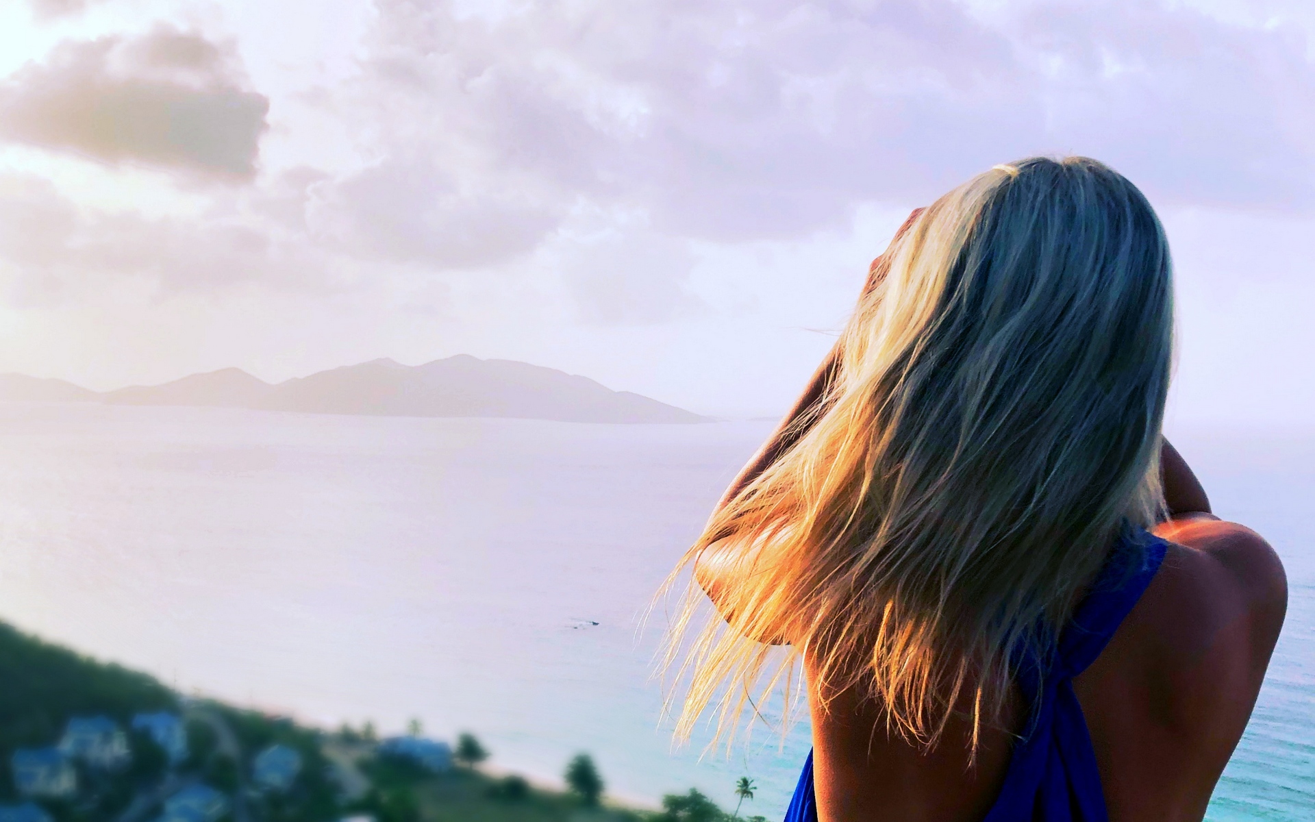 Description: A woman standing on a hill looking at the ocean and mountains in the distance with a bird flying overhead.
