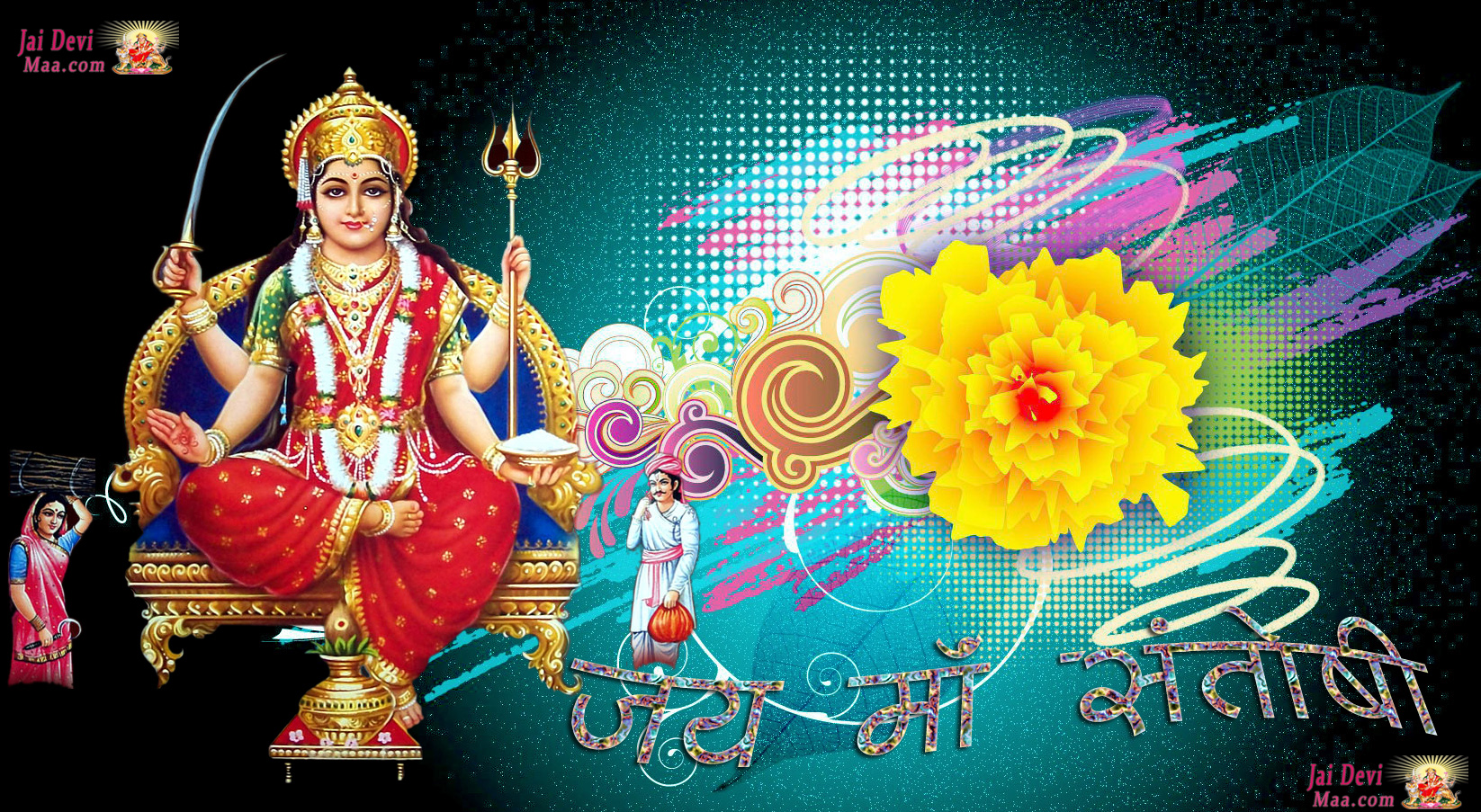 Description: A colorful image of a hindu god with a flower on it's lap and a happy message in the middle.