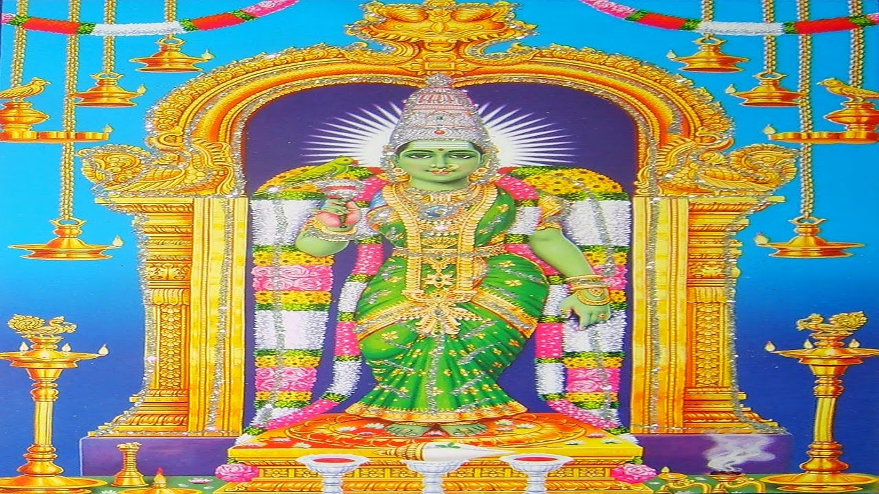 Description: A painting of a hindu god sitting on a throne with candles around him and a blue background with gold trim.