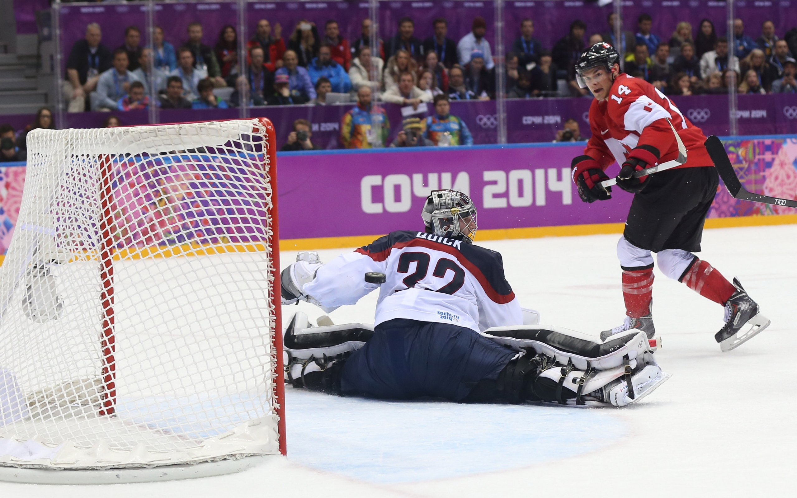 Description: A goalie is trying to block a shot by a goalie in a hockey game in front of a crowd.